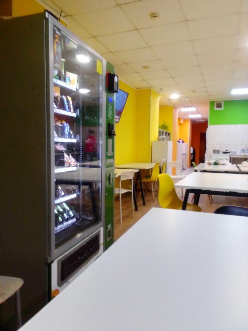 Помещение кухни тоже большое пространство, много столов,есть кофейный аппарат и аппарат со снеками, очень удобно.В хостеле очень чисто,это приятно,уборка качественная.