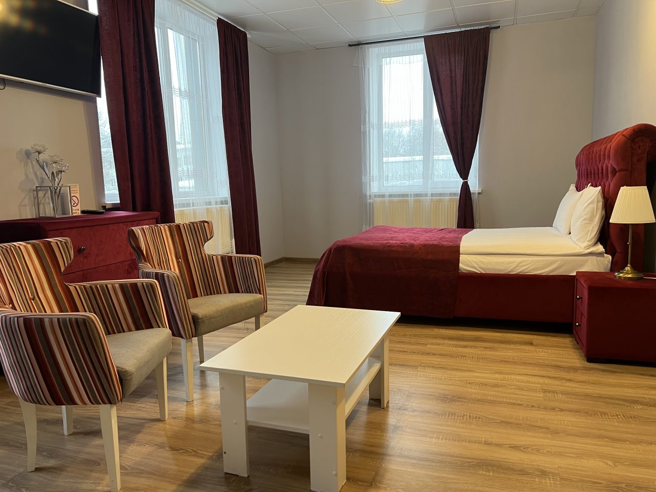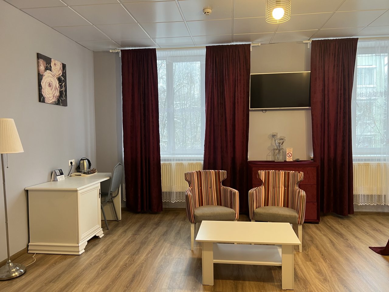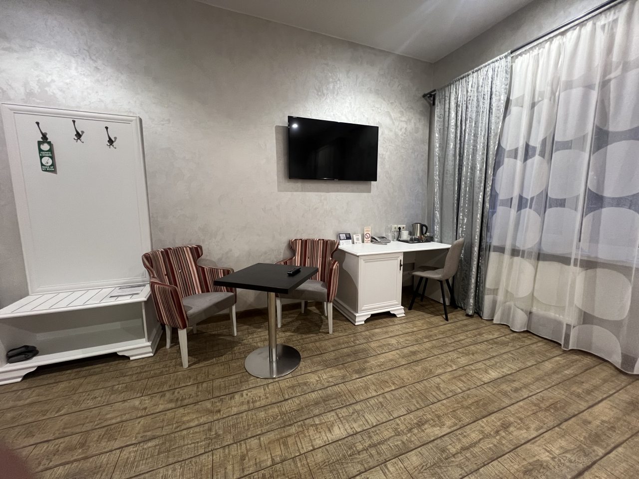 Приветливый, отзывчивый персонал. Большой, светлый номер. Все работает хорошо. Телевизор, фен, вода, канализация.... Ежедневная уборка номера по желанию. У нас номер стандарт и тоже входит услуга. Можно заказать питание, цены очень приемлемые и аппетитное меню. До метро 8 минут. Парковка на территории довольно большая.
