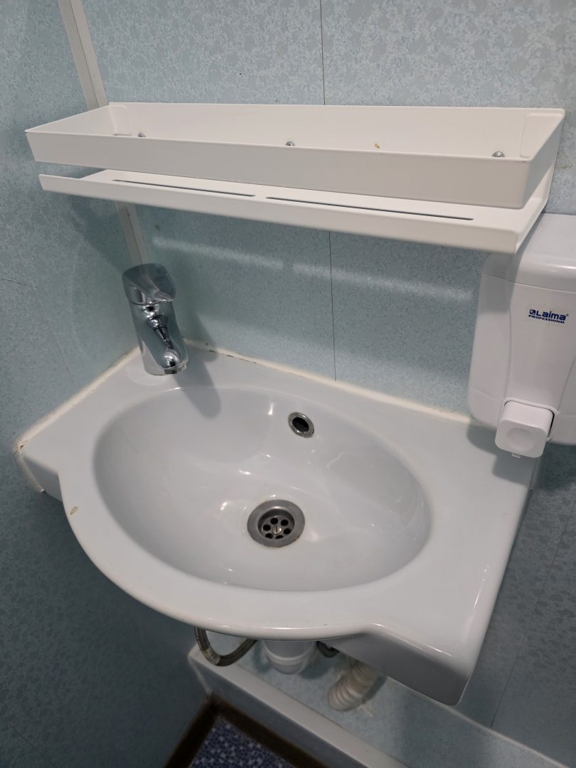 В ванной маленькая премаленькая раковина и низко висит полочка для косметических принадлежностей, лицо умыть ещё та проблема, вся вода на полу.