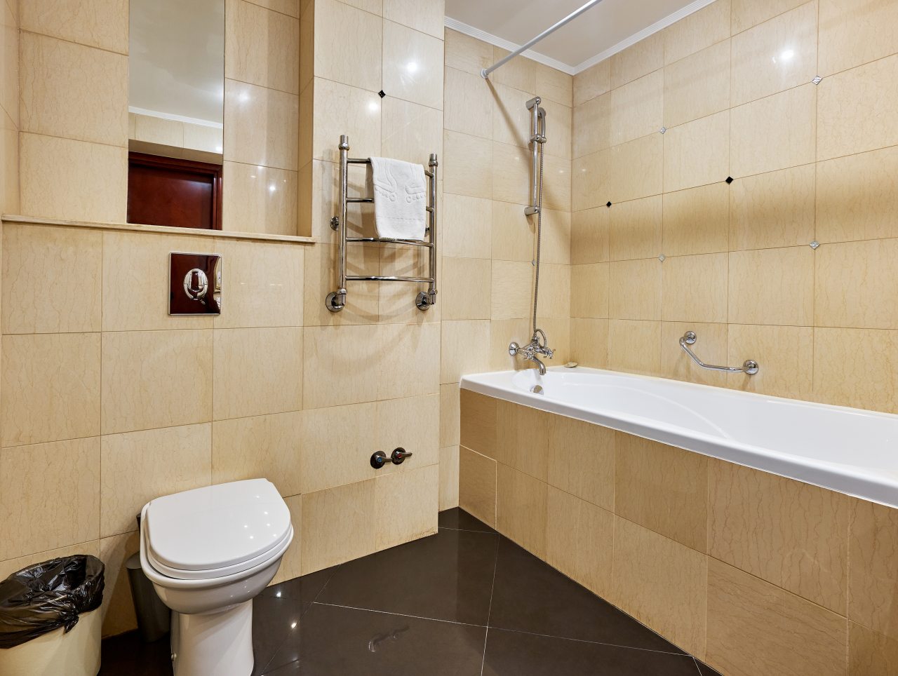 Кровать облезлая, в ванной слив засорен, унитаз живет своей жизнью. Подоконники достаточно низкие, на окнах нет ограничителей. При заселении с детьми, будет внимательны.