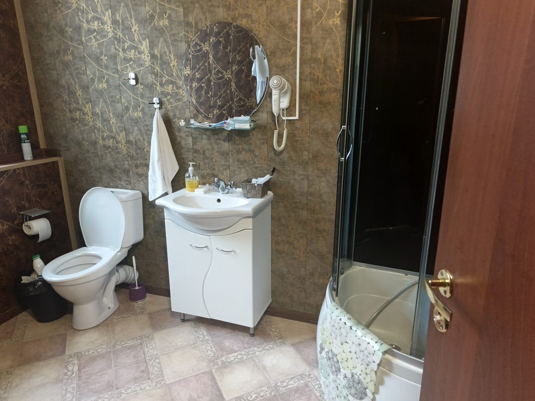 Абсолютно всё соответствует заявленному. Отель 2-звездночный, но я видела и трешки в сто раз хуже. Номерной фонд не большой, от этого уютно, тихо и больше внимания персонала к гостям- девочки очень вежливые и приветливые.Номер большой (у нас люкс), чистый, атмосферный, кровать очень удобная, постельное качественное отельного типа (не дешовое), есть кондиционер, ТВ, камин, холодильник, фен, чайник, посуда, чай, кофе, многоуровневый свет( и потолочный, и настенный и напольный светильники), мебель в отличном состоянии, нигде ни пылинки (я аллергик,и сразу реагирую, для меня чистота не прихоть, а жизненная необходимость, и учитывая,что в номере ковролин), санузел большой, достаточно полотенец, одноразовые гель для душа, шампунь, зубные щётки, паста, большая бутылка мыла, халаты, одноразовые тапочки, даже освежитель воздуха в туалете оставлен. Отдельно заказали завтраки (450 на одного) - их 5 на выбор, очень сытные, вкусно и вовремя принесли в номер. Администратор подсказал, где можно покушать, где есть какие магазины поблизости. И для нас особенно удобно, что рядом всё, для цели нашего приезда.