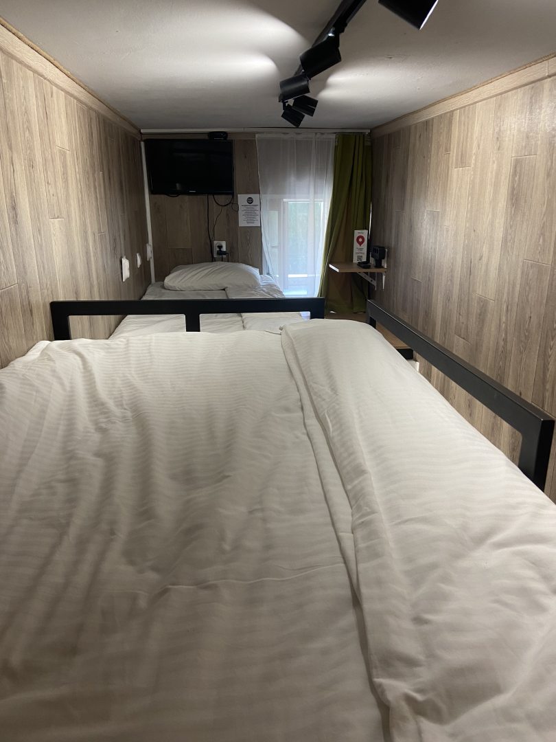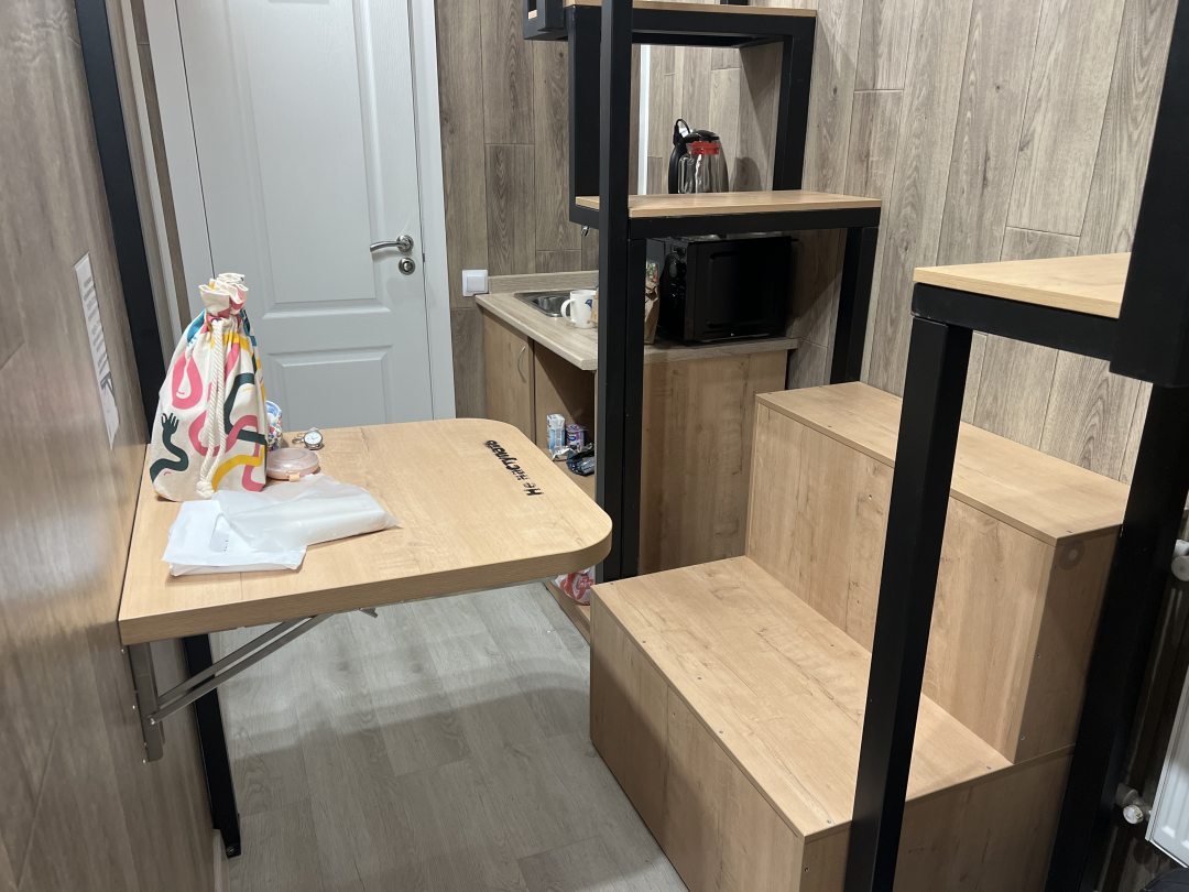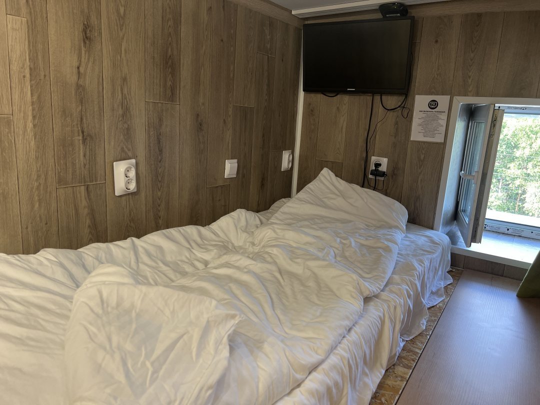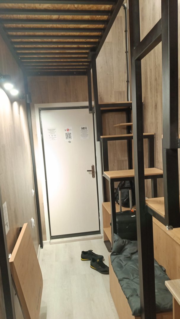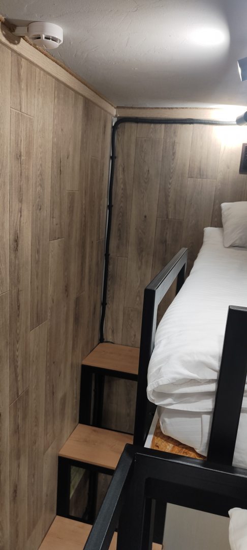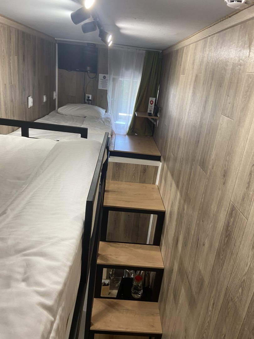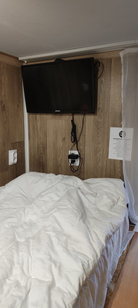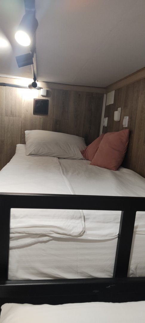 Очень удобный и продуманный номер. Сделано по типу каюты. Номер маленький, компактный, современный. У нас была каюта номер 20. При входе вешалки, полочки для одежды и обуви. Мини кухня (раковина, микроволновка, чайник). Столик откидной. Туалет и ванна. Кровати по ступенькам вверх и ТВ. Наверху всё продумано, зарядки, свет, подставки под телефон. Если спать головой друг к другу, то вставать и залезать удобно с обеих сторон. После длительных прогулок, правда было тяжелее. Матрасы очень мягкие и удобные. Наверху отличная система вентиляции, включали, становилось не жарко. Всё чисто и современно. На 2-3 ночи идеально. Нам на двоих с мужем было прекрасно