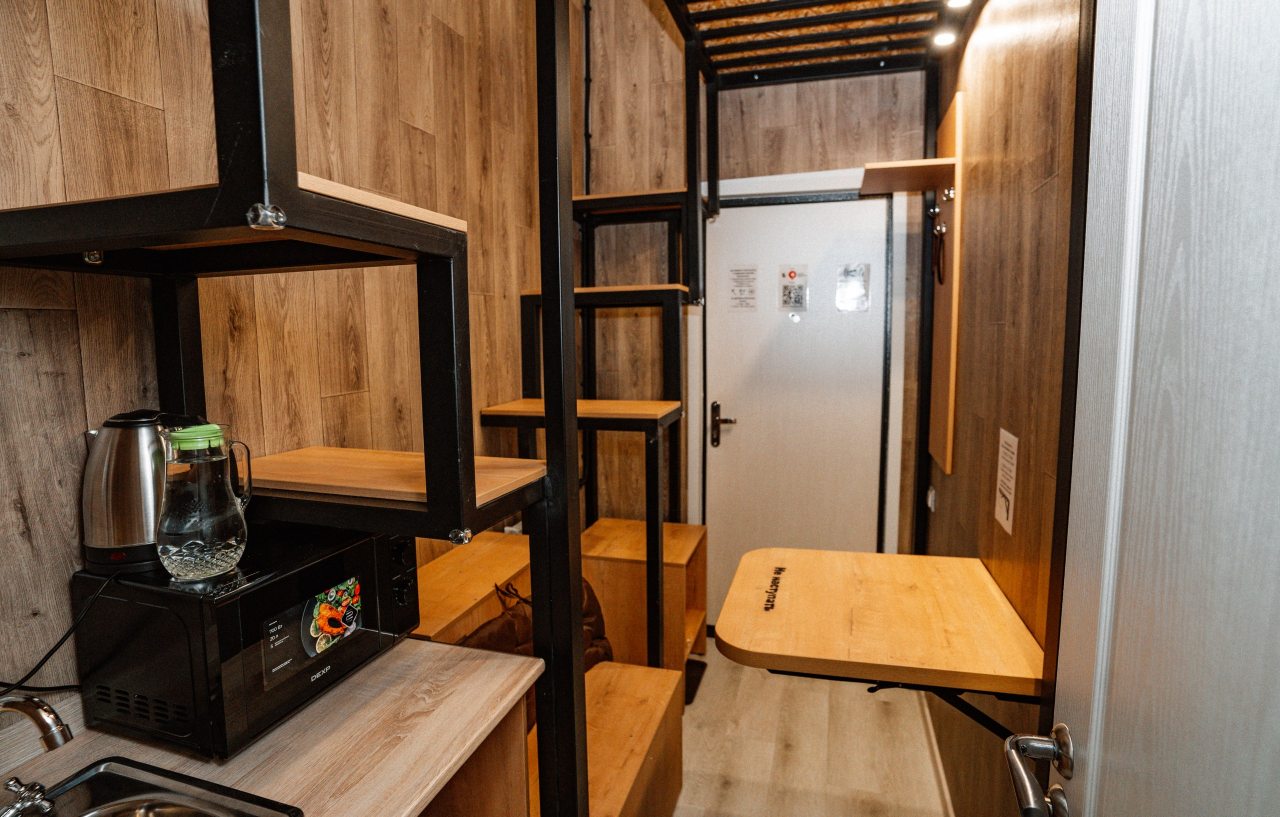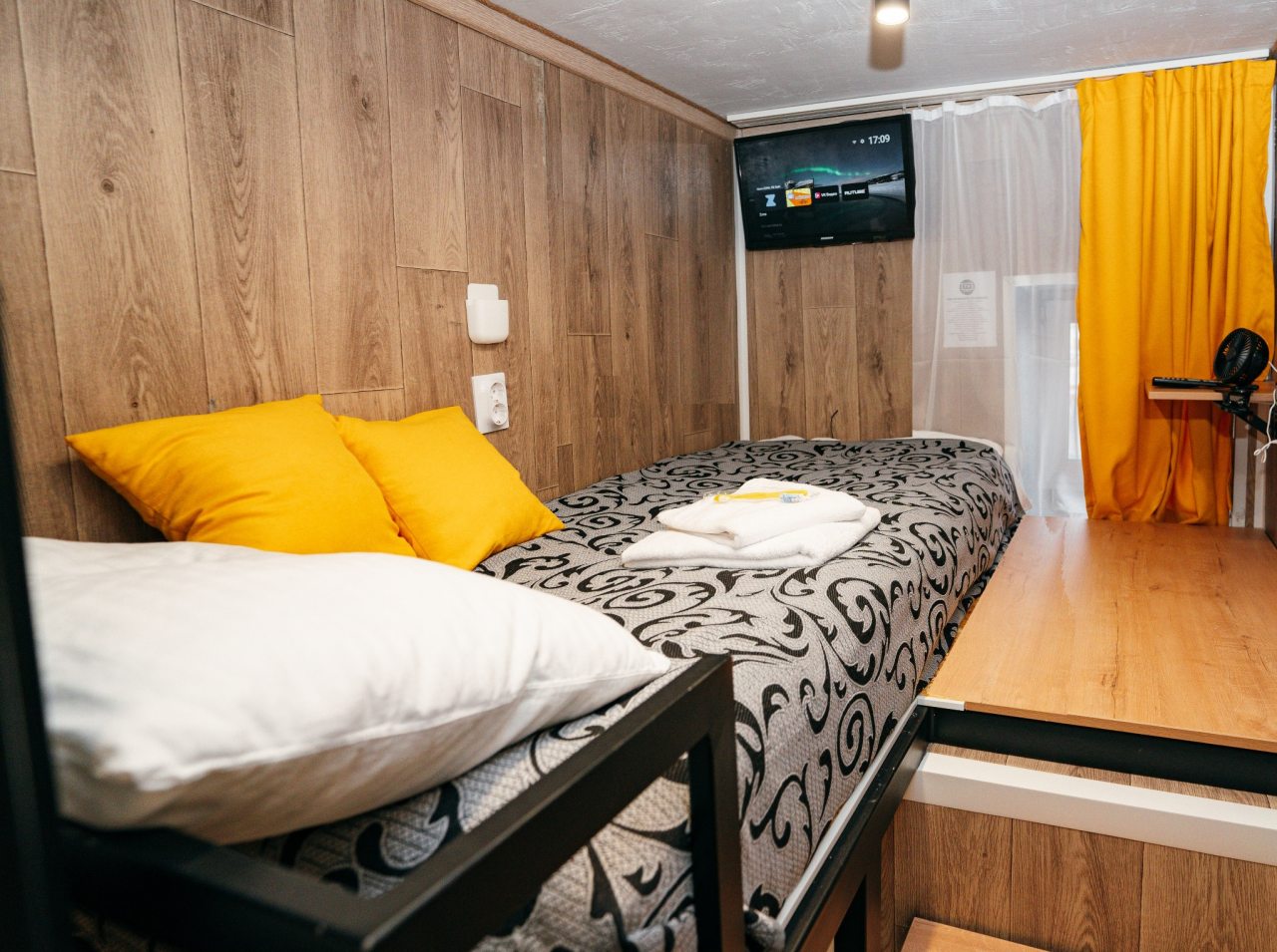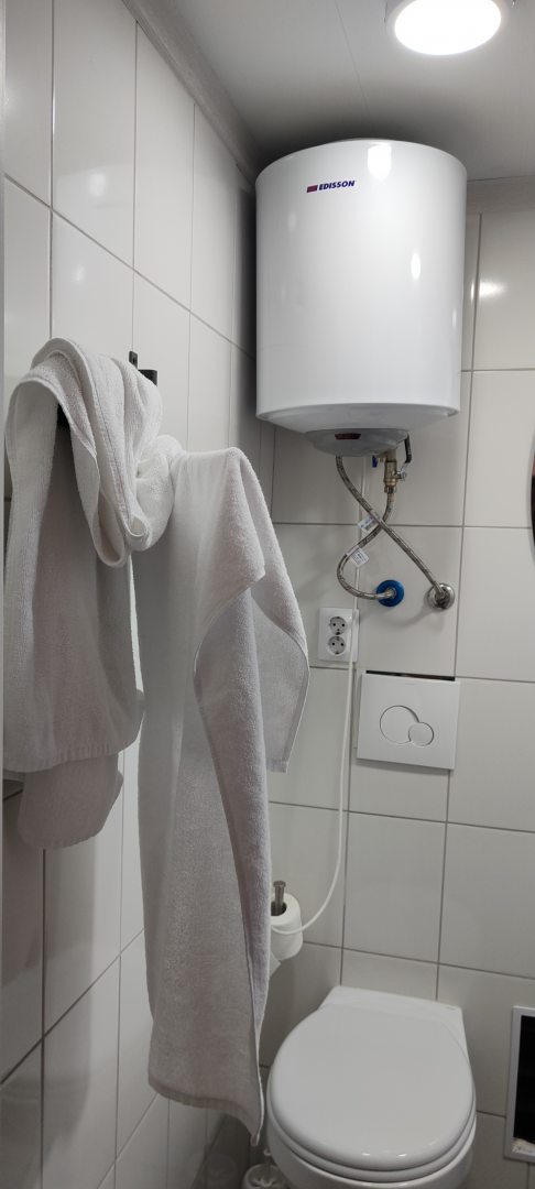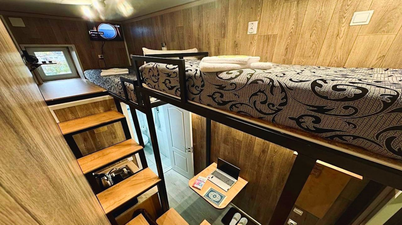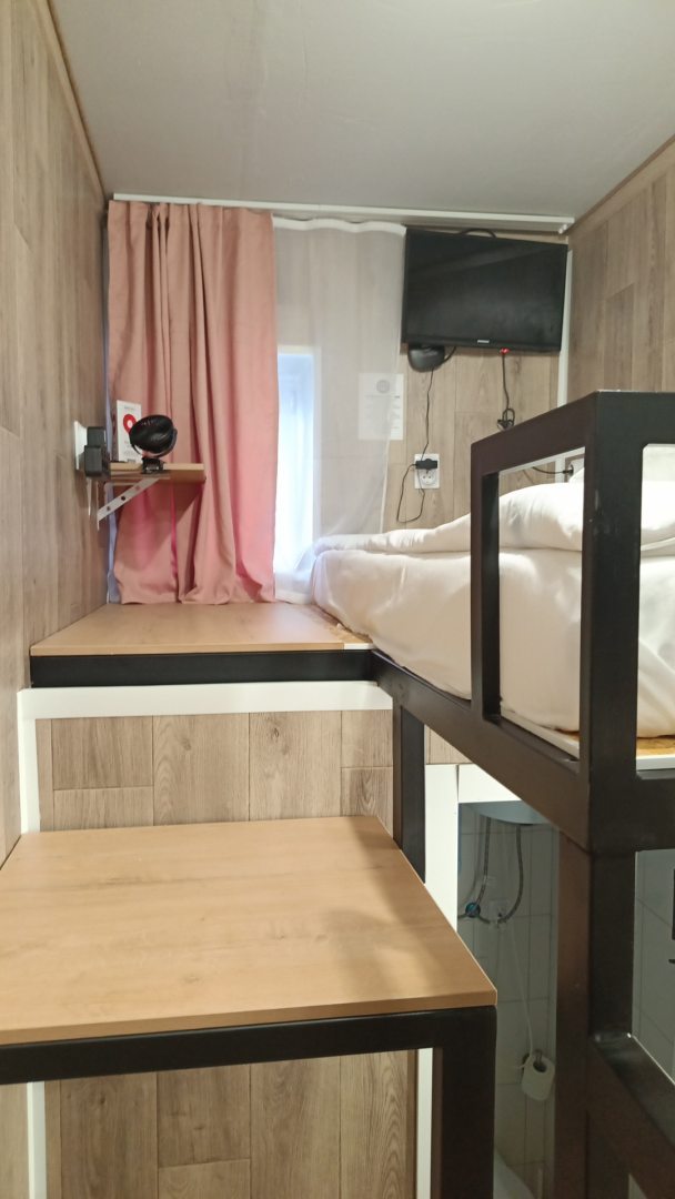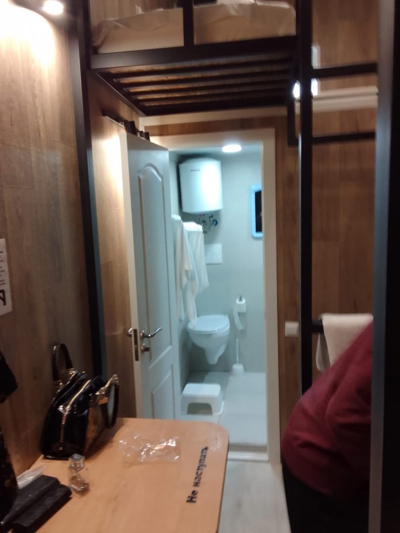 Очень удобный и продуманный номер. Сделано по типу каюты. Номер маленький, компактный, современный. У нас была каюта номер 20. При входе вешалки, полочки для одежды и обуви. Мини кухня (раковина, микроволновка, чайник). Столик откидной. Туалет и ванна. Кровати по ступенькам вверх и ТВ. Наверху всё продумано, зарядки, свет, подставки под телефон. Если спать головой друг к другу, то вставать и залезать удобно с обеих сторон. После длительных прогулок, правда было тяжелее. Матрасы очень мягкие и удобные. Наверху отличная система вентиляции, включали, становилось не жарко. Всё чисто и современно. На 2-3 ночи идеально. Нам на двоих с мужем было прекрасно