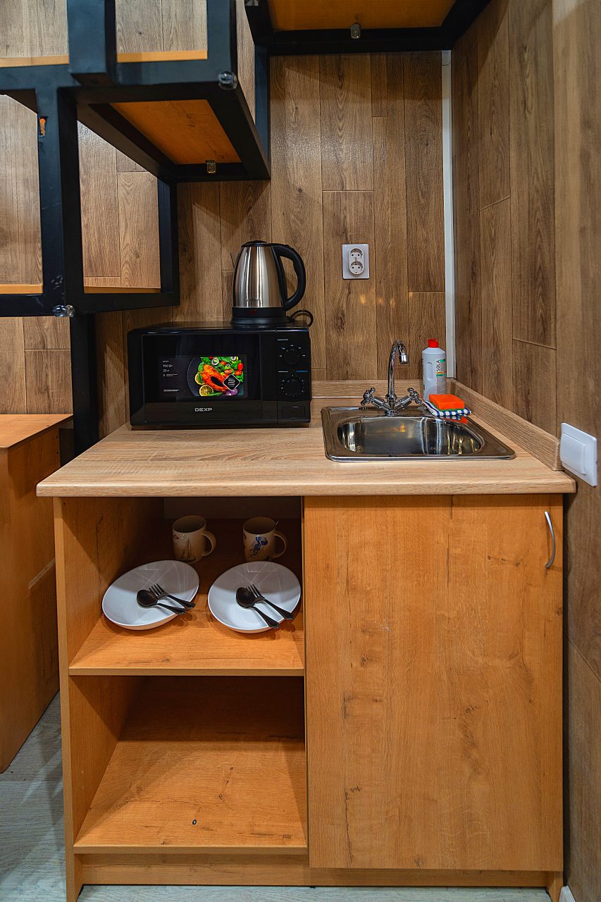 Необычная концепция отеля. Номер выполнен в тематике каюты корабля. В номере имеется ванная комната, туалет, микроволновая печь, чайник, кувшин для воды вешалка для одежды, тумбочки, стол телевизор. Рядом с отелем расположен магазин магнит, остановка общественного транспорта.