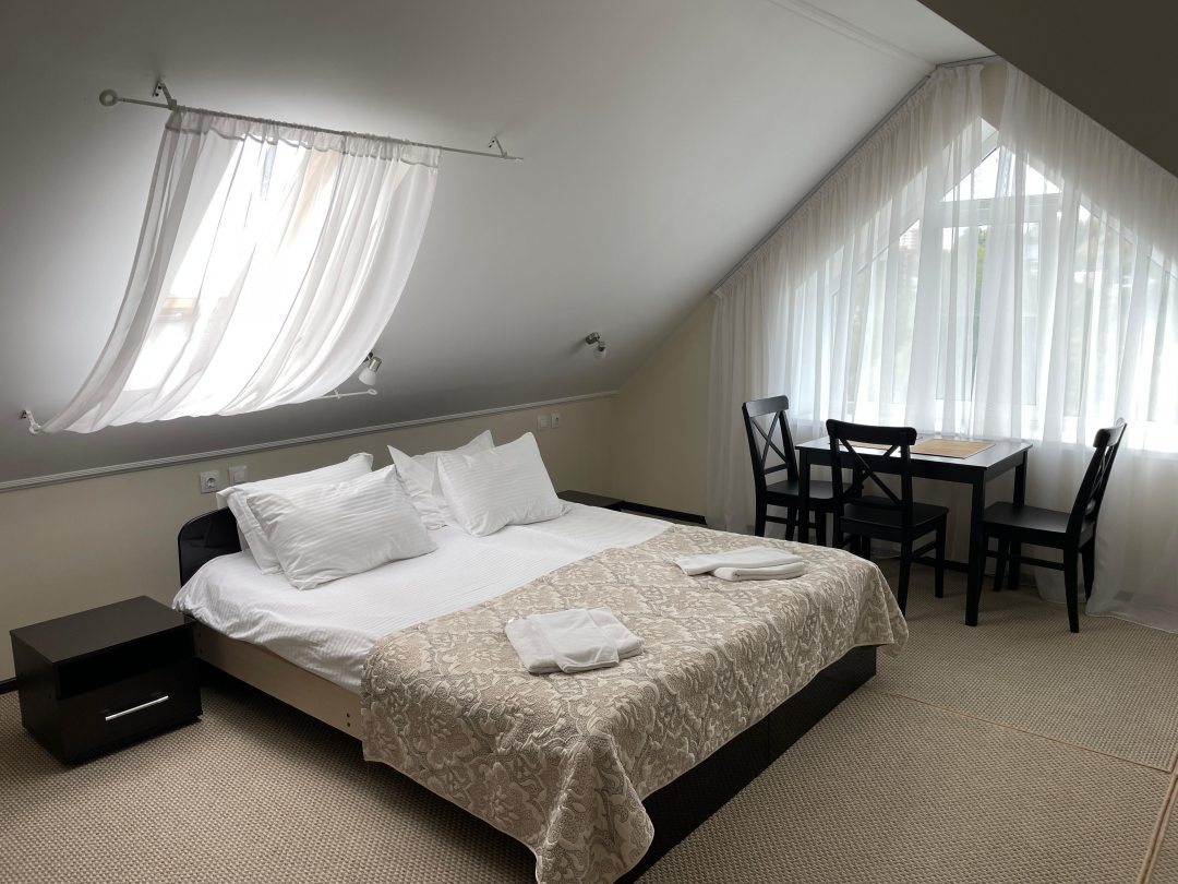 Мы жили в мансардном номере с гардеробной - прекрасный вид на море и горы, номер просторный и чистый, хорошая душевая, качестенное постельное бельё и полотенца. В номере холодильник, чайник, фен, чашки.