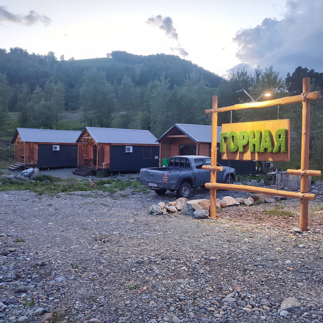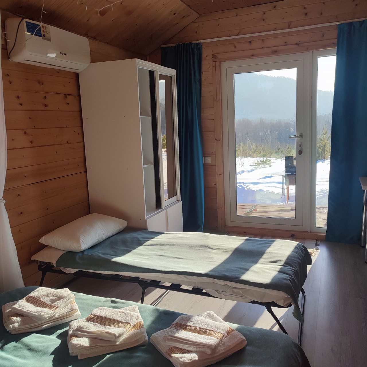 На базе отдыха предлагаются комфортабельные домики со своим отдельным туалетом и душем. Отделка деревянная внутри, но благо запаха сырости нет. Электричество подведено, имеется здесь нужное количество розеток, холодильник, микроволновка, фен. Сразу при выходе из домика открывается потрясающий вид на горы. Воздух здесь изумительный! Ощущения, которые запомнятся надолго после отдыха!