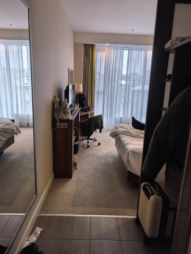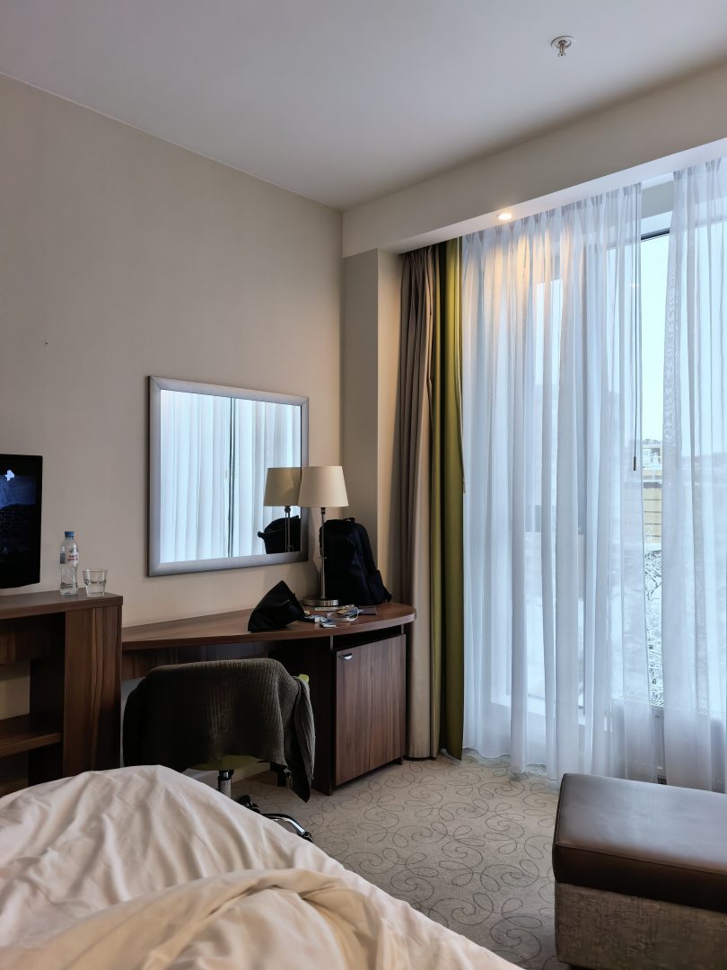 Проживали в номере стандарт 2 взрослых, отдельные кровати, очень понравились панорамные окна, вид из окна, особенно ночью, кровати удобные, чай, кофе в номере, в ванной все необходимое, хороший фен, утюг и гладильная доска в номере, посуду и вазу выдали по нашей просьбе, прекрасный завтрак, на любой вкус, даже хумус и пророщенные травки, в мой день рождения был комплимент от отеля, приятно!