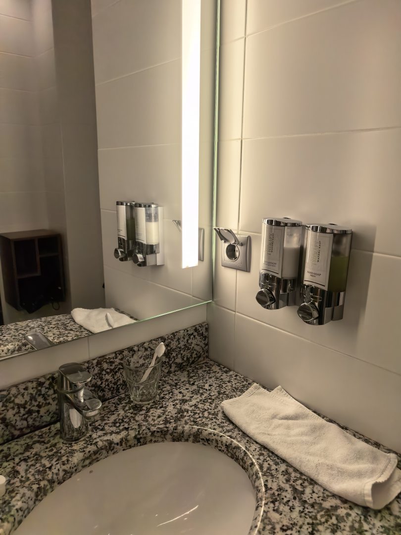 Номер маленький, но удобный и чистый. Очень хорошая качественная косметика . Вода, чай, кофе , сахар и сливки есть. Тапочки.