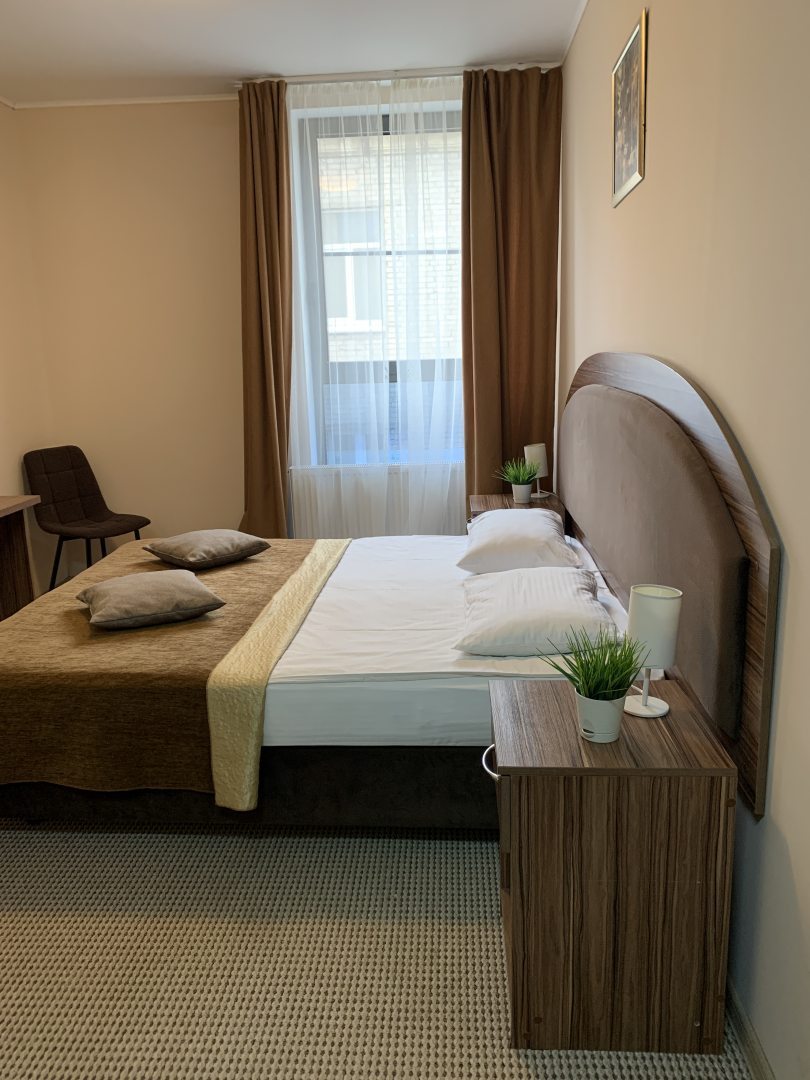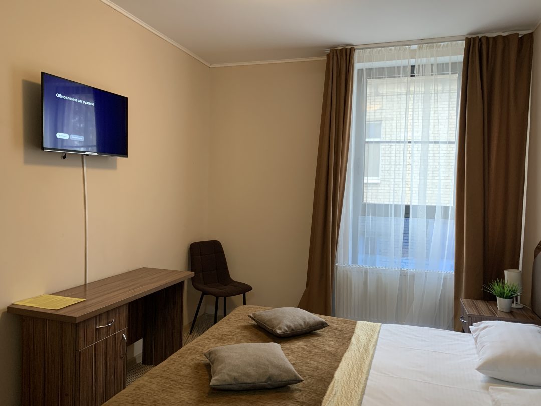 Номер полностью соответствует фото, уютный и просторный. Дверь запирается обычным ключом (что лично я люблю больше, чем электронные замки). Убрано в целом хорошо (кроме отдельных мелочей). В таком номере приятно жить. Хорошая кровать, хорошее бельё. Электрочайник. Чашки, тарелки, ложки, вилки (по 2 шт.). Маленький тихий холодильник, совершенно не мешающий спать. И вообще тихо. Окна открываются нормально, можно проветривать. На окнах есть сетки от комаров (сейчас не очень актуально, но вообще это плюс).