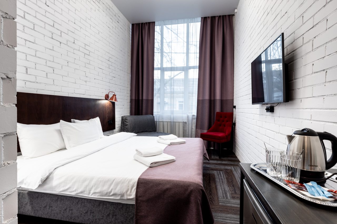 Прекрасное расположение рядом с метро, очень вежливый, отзывчивый персонал, любезно предложили нам путеводитель, кофе из кофемашины очень вкусный, можно налить самому в любое удобное время. Просто шикарная огромная кровать с прекрасным ортопедическим матрацем, белоснежное белье! Хорошая сантехника в ванной, очень чисто, полотенца с логотипом отеля тоже белоснежные, мягкие. Шикарные шторы, мебель новая, мягкие стулья в тон шторам. Холодильнику новый, ничем не пахнет, морозит отлично. Есть все для чая. Номер очень уютный. Конечно маловат по площади, но в следующий раз выберем полулюкс, а не стандарт. Название Крепкий сон оправдано, ничто не мешало крепкому сну. Полотенца меняли на следующий день, предлагали уборку, но мы попросили только выбросить мусор. Плюс , что машина на бесплатной стоянке во дворе отеля! В следующий раз хотим опять остановиться в Нижнем Канавинская. Номера оформлены с любовью!
