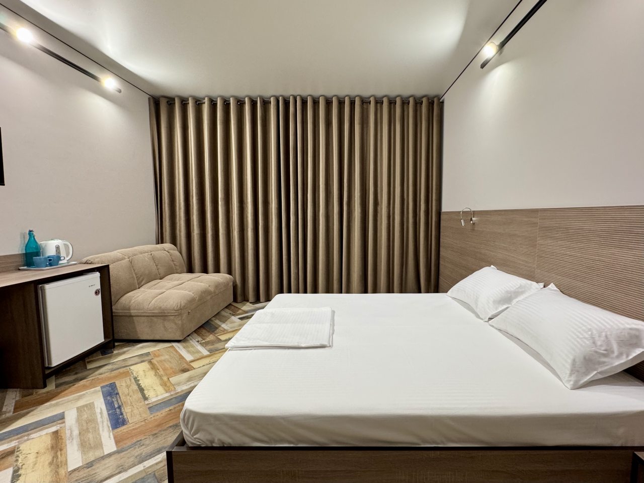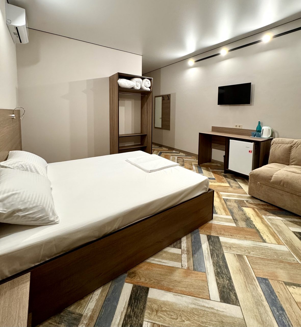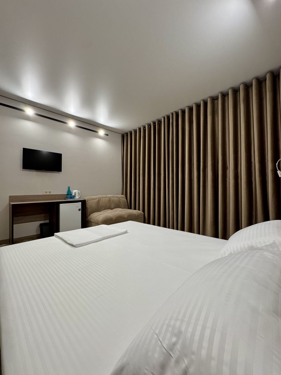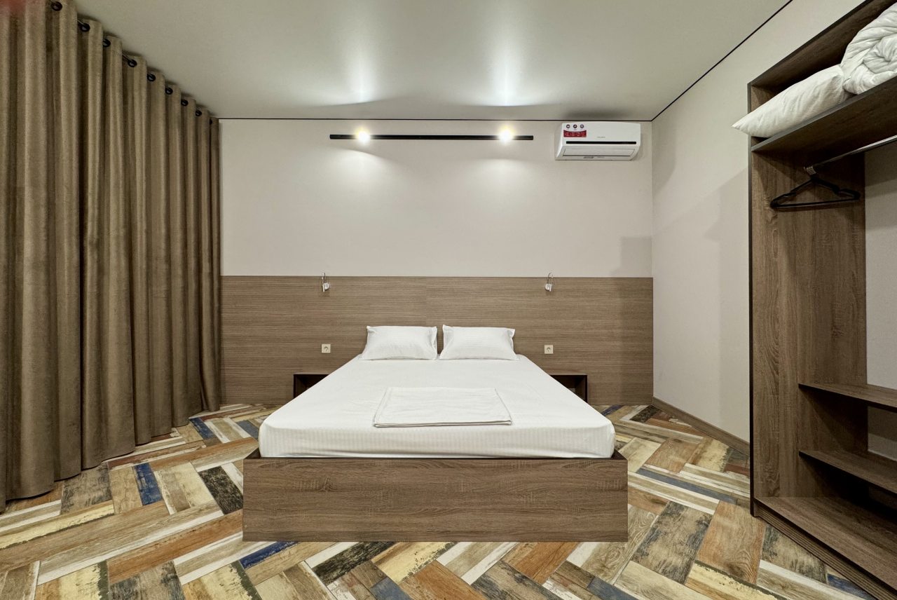 В Новочеркасск приезжали на несколько дней, брали с супругой здесь номер на двоих. Спальные места раздельные, но мы попросили сдвинуть кровать заранее, и нам все подготовили как надо. Номер узкий, но удлиненный - остается место. Для одежды небольшой стеллаж присутствует, климатическая техника вмонтирована. В санузле удобно. Свет зонирован по периметру комнаты. Обслуживание хорошее здесь.