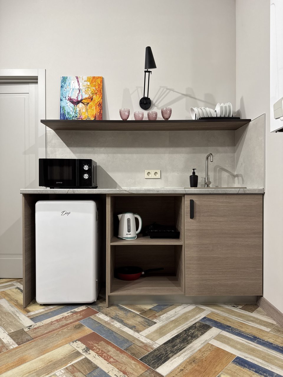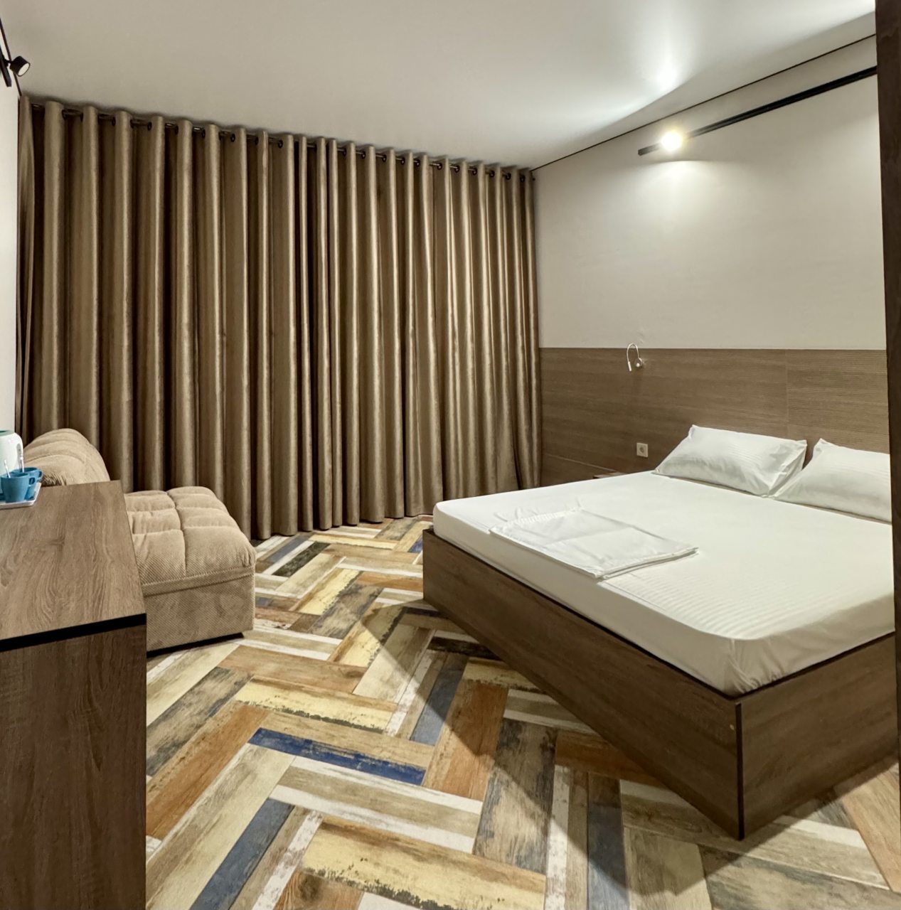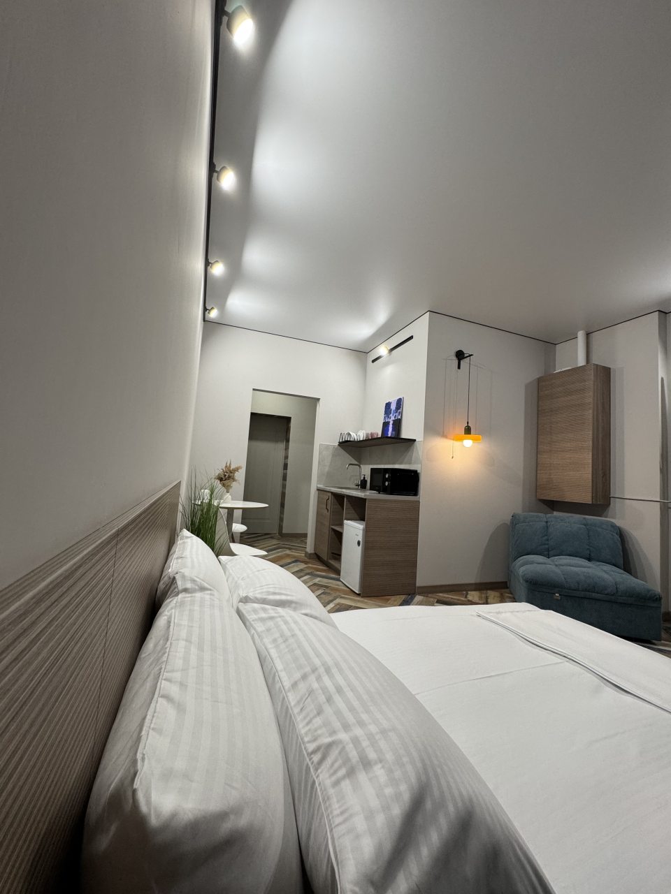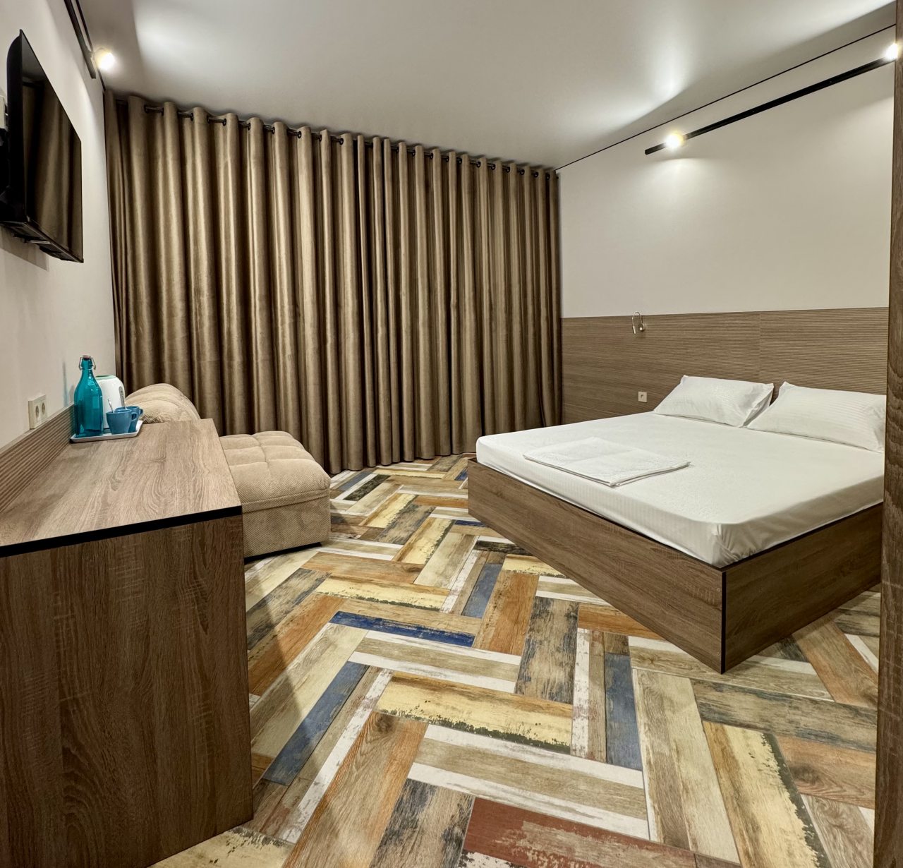 В Новочеркасск приезжали на несколько дней, брали с супругой здесь номер на двоих. Спальные места раздельные, но мы попросили сдвинуть кровать заранее, и нам все подготовили как надо. Номер узкий, но удлиненный - остается место. Для одежды небольшой стеллаж присутствует, климатическая техника вмонтирована. В санузле удобно. Свет зонирован по периметру комнаты. Обслуживание хорошее здесь.