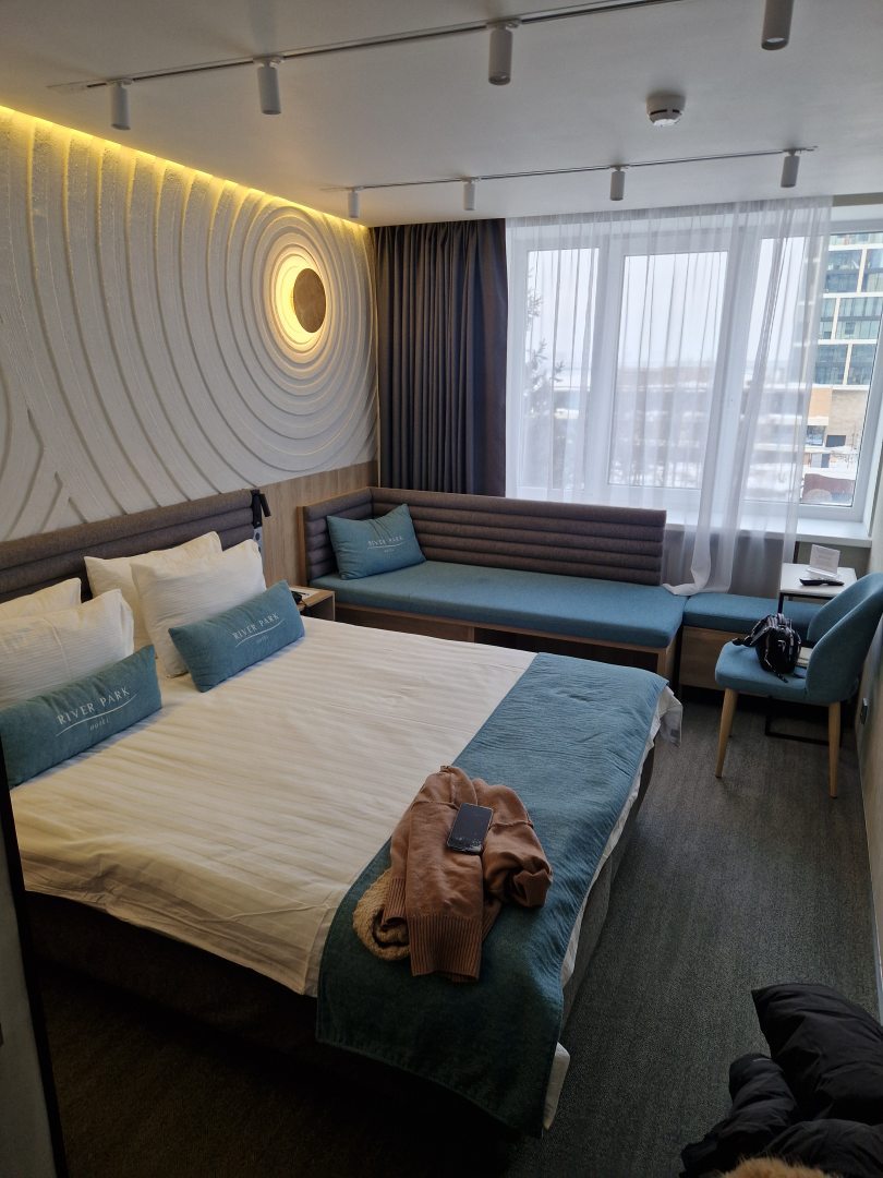 Находились в отеле одну ночь. Приехали поздно вечером. Стоянка бесплатно, на территории отеля. Все быстро и четко показали куда встать. В отеле встретили приветливо, сразу дали номер, предложили доп.услуги, типа завтрак, напитки в номер. Номер стандарт. Все нужное есть, душ, холодильник. Белье не влажное, кровать удобная. Отель могу порекомендовать.
