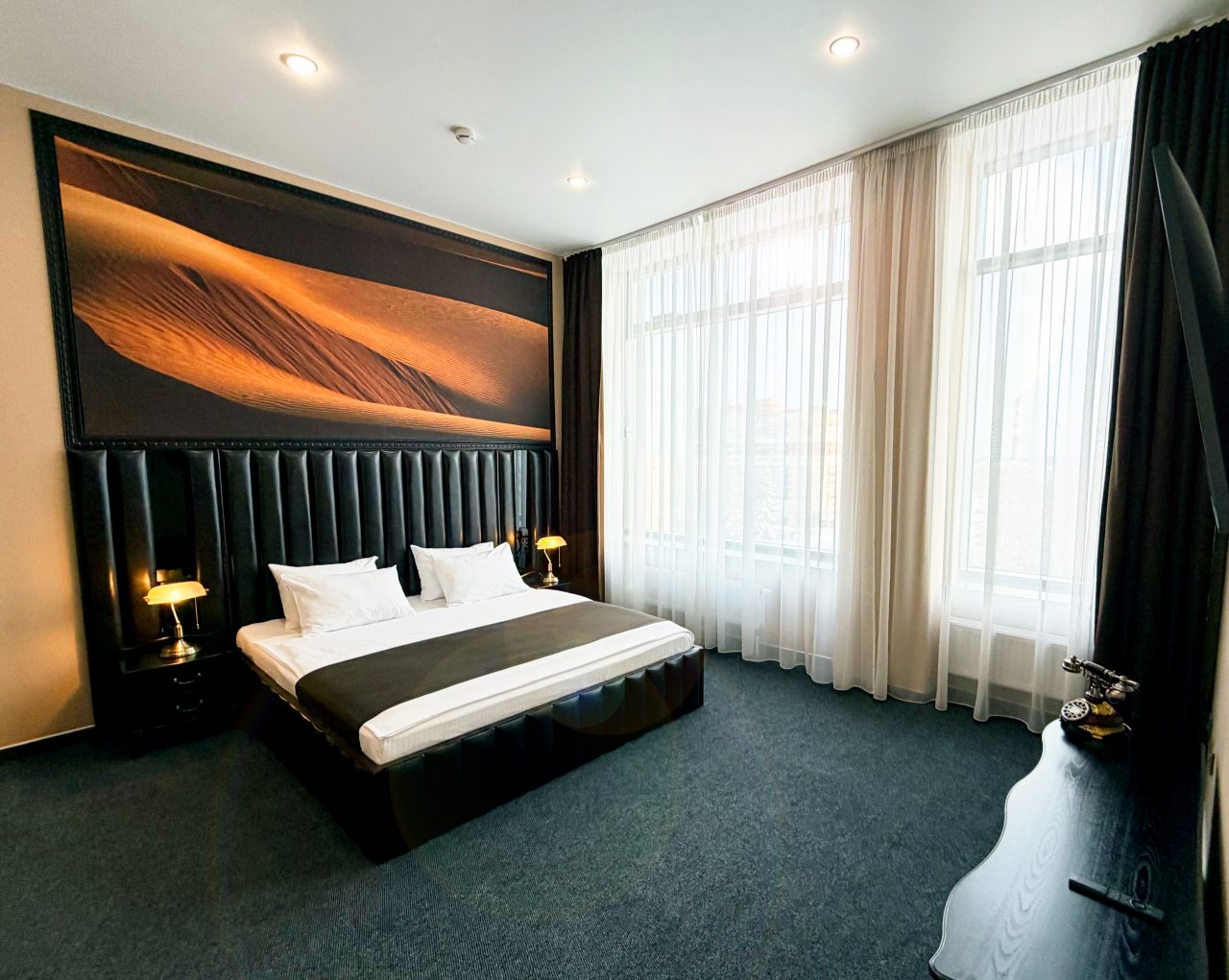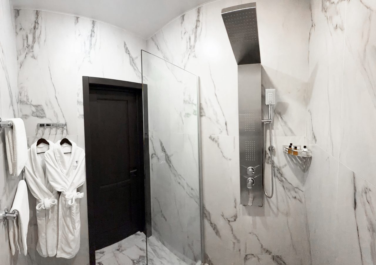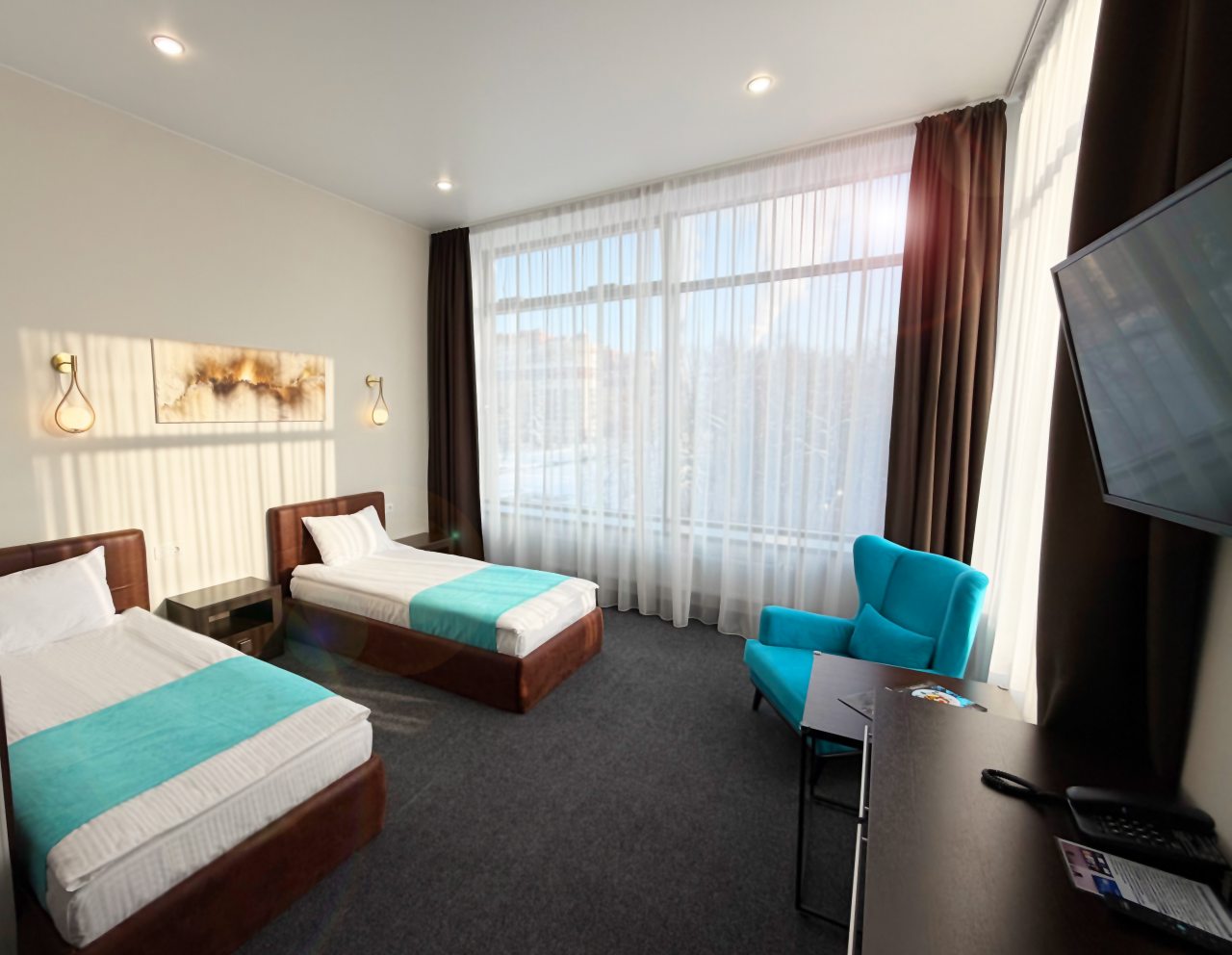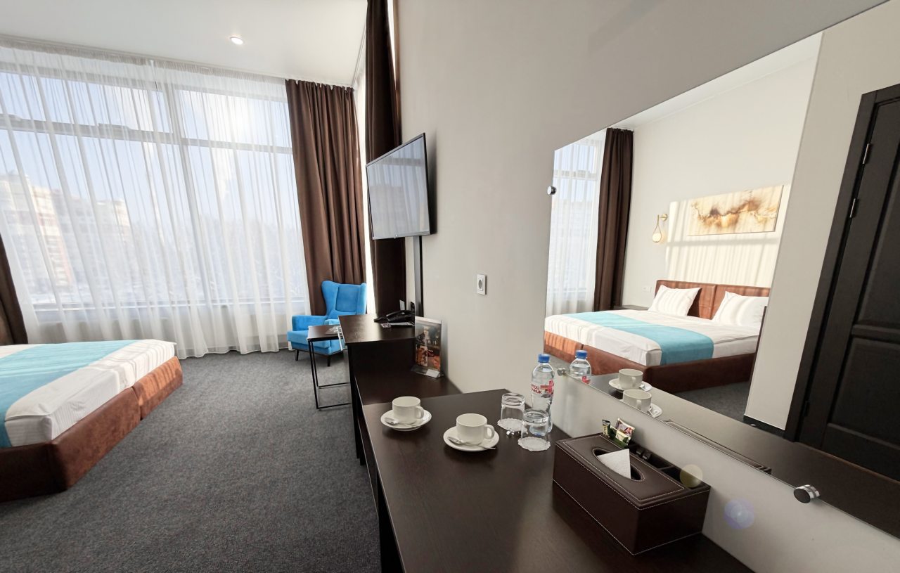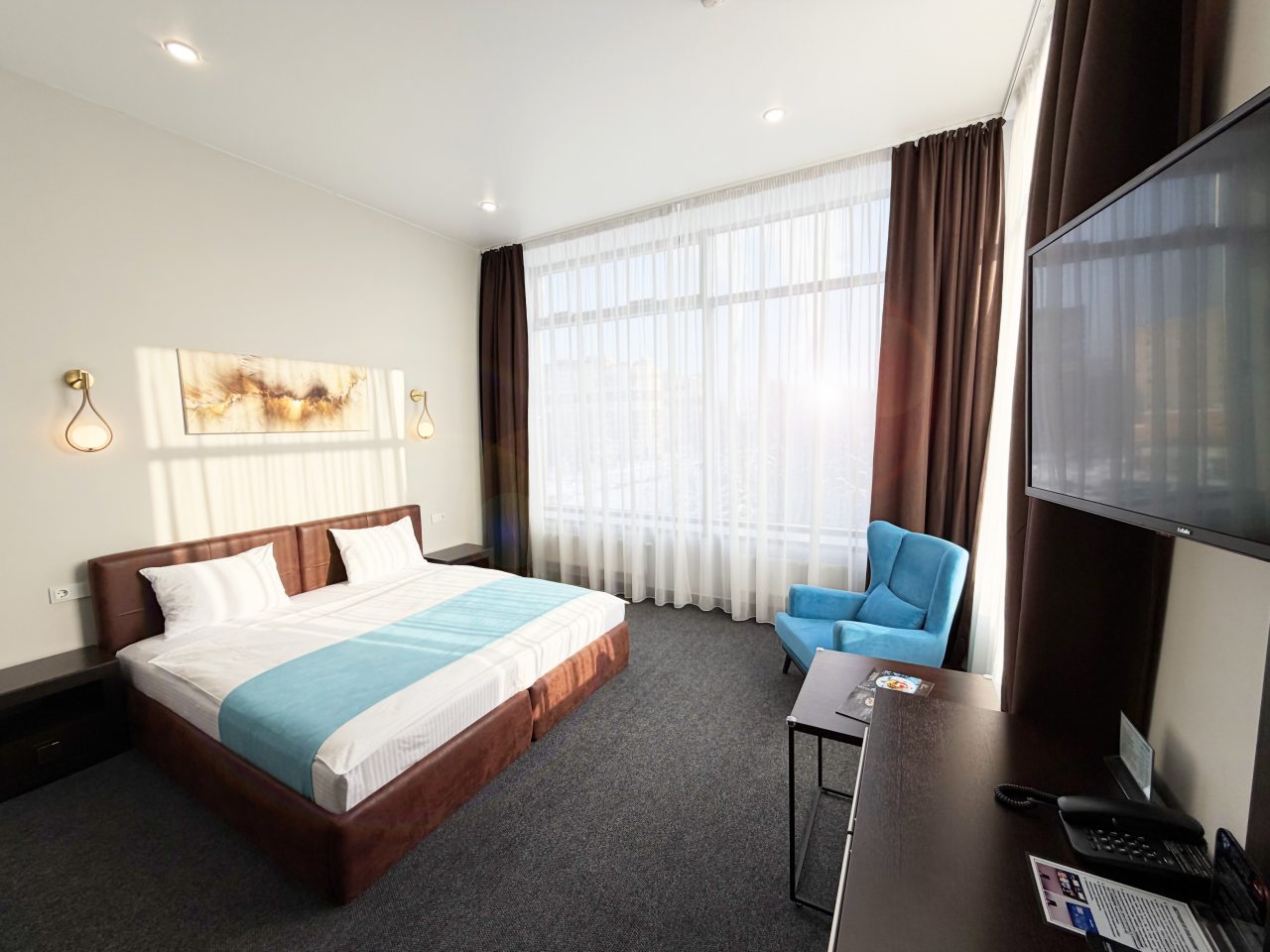 Все очень хорошо, чистота, уют как в самом отеле, так и в номере, атмосфера тихая спокойная, приветливый персонал всегда готовый прийти на помощь,в номере есть телевизор(администратор помогла настроить), чайник с набором для чая, халат, набор полотенец, тапочки с логотипом отеля, набор для умывания (шампунь , кондиционер , мыло, паста, щётка зубная , расчёска ), фен,кровать очень удобная, отлично выспалась, удобный санузел, а какое великолепное кресло в номерепрекрасный завтрак (шведский стол, выбор на любой вкус : и кашки, и блинчики простые и блинчики с творогом, сам творог, овощи, сыры, ветчина, колбаса, рыбка красная, фрукты, орехи, соки, чай на выбор, кофе, круассан , шарлотка и еще много всего, все очень свежее и вкусное, бизнес-ланч на выбор тоже очень вкусный!