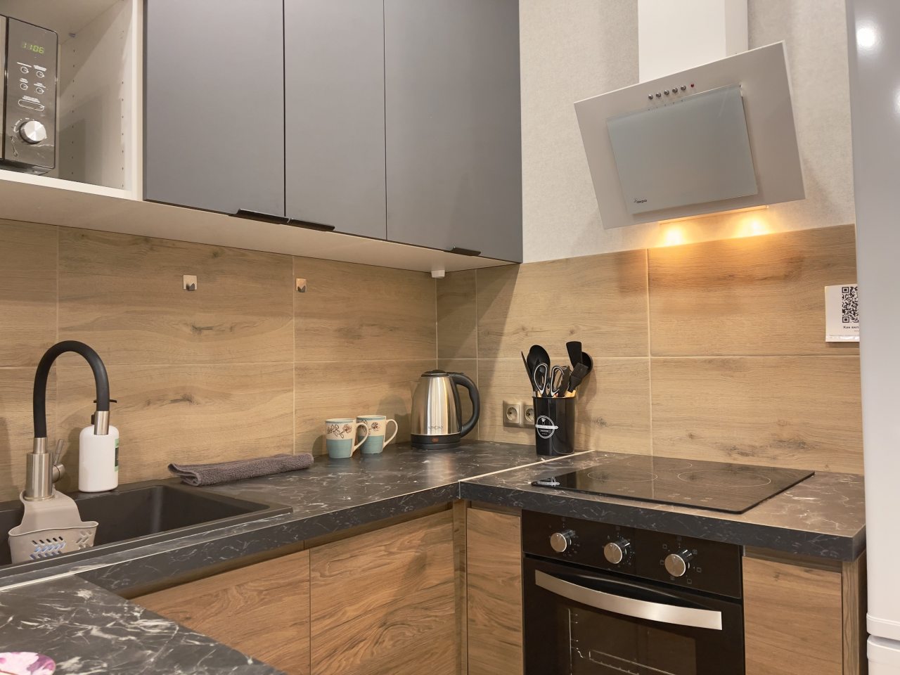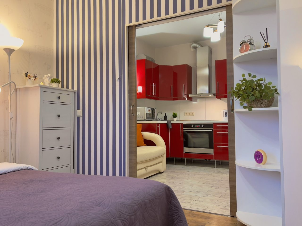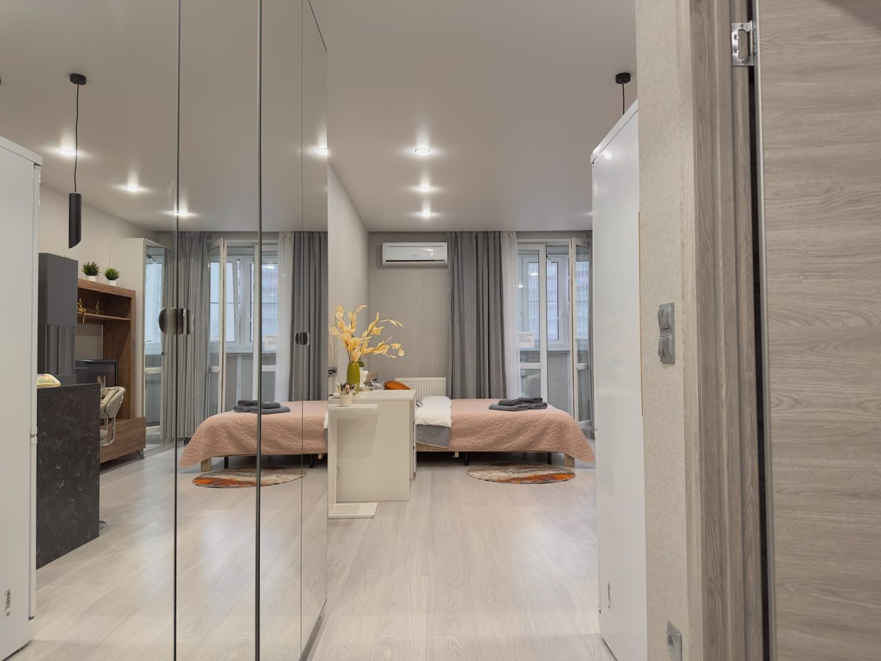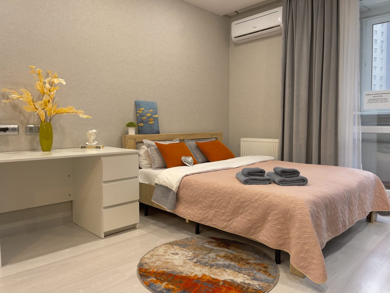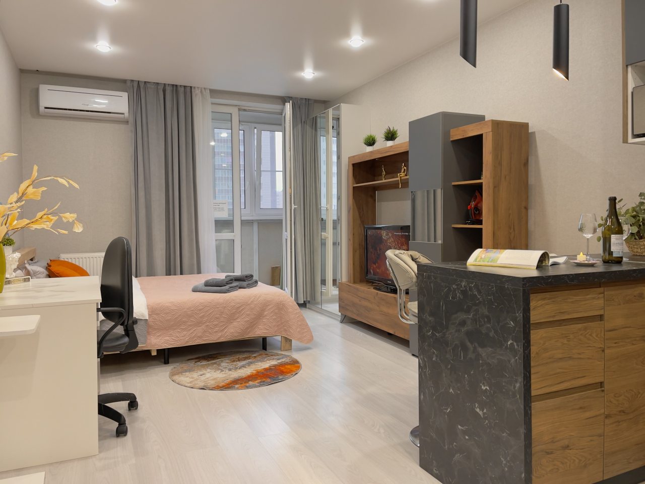 Студия небольшая, но нам она понравилась. С кухонькой, кроватью, ванной комнатой. Оставили полотенца и средства гигиены, очень выручило, поскольку ничего такого мы с собой не брали. Техника вся исправная, можно вести полноценный быт. Место тоже хорошее, есть и аптеки, и магазин, еще и транспорт ходит. Жилось комфортно.