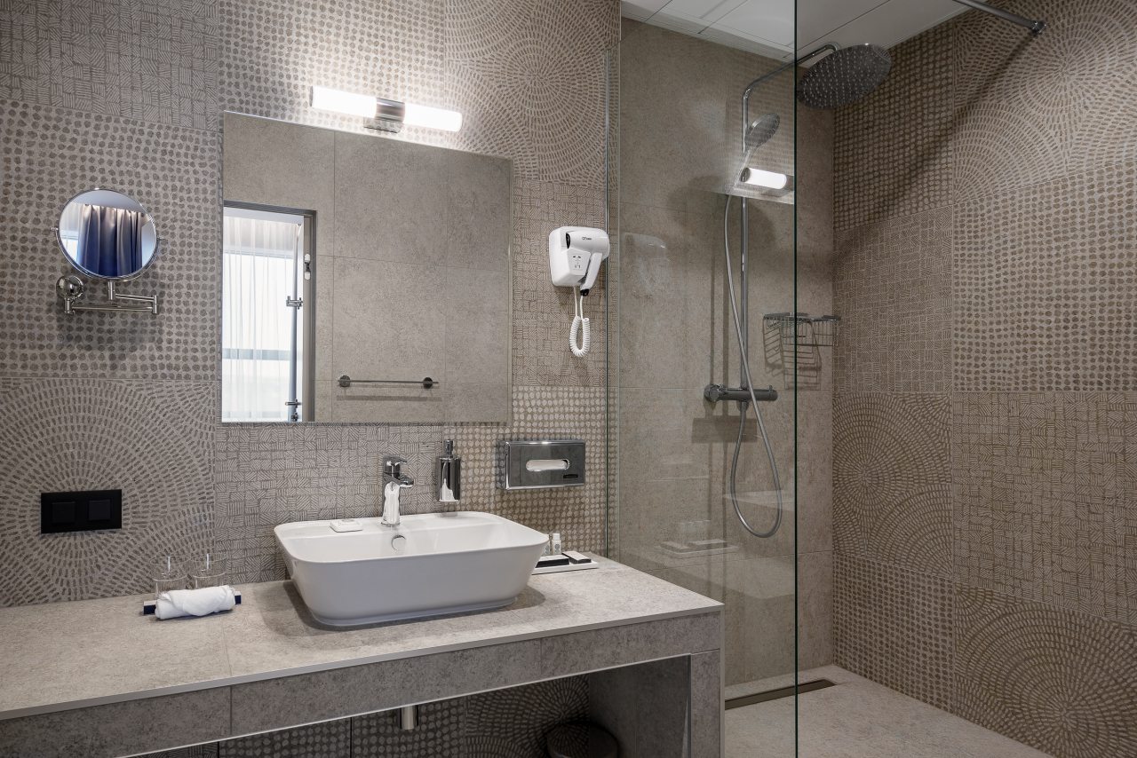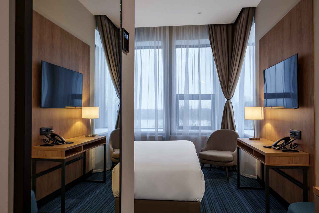 Отель расположен в центре города, но не в шумной части на берегу Иртыша. Вокруг нет жилых домов (за одним исключением). В номере очень чисто, сам номер (стандарт) удобен для одиночного проживания. Прекрасная кухня (цены высокие, но вполне соответствуют качеству и не сильно отличаются от других сопоставимых отелей. Есть доставка блюд в номер, ждать практически не пришлось. В номере есть все основные бытовые принадлежности, включая утюг. Кондиционер.