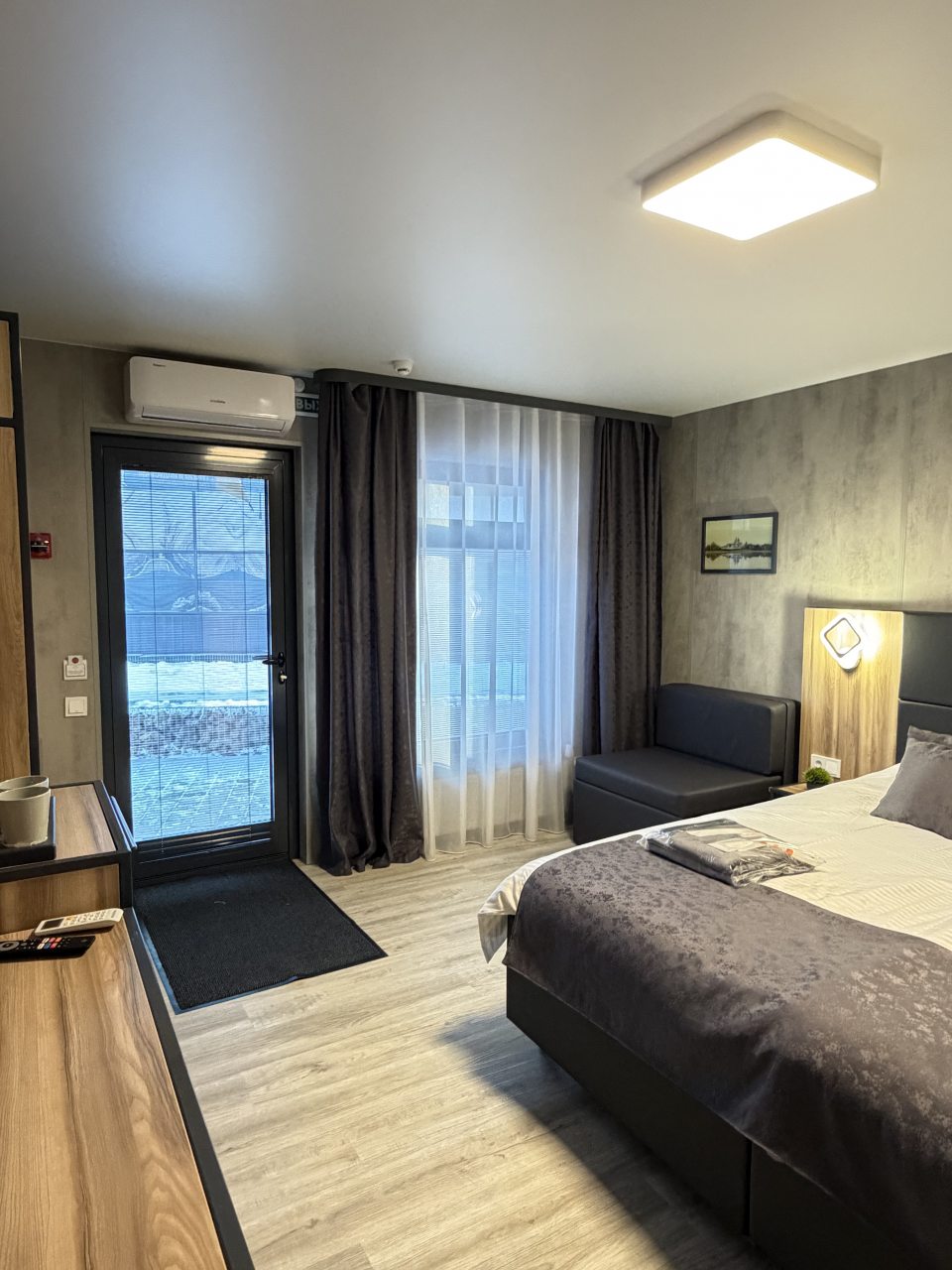 Мы ехали с границы , на которой находились 16 часов ( при этом не спав ночью ) мы были супер уставшие , и нам был необходим отдых . По приезду нас быстро оформили , заселили ,милая девушка подсказала где можно вечером покушать . Сам номер находился в отдельном домике , очень уютный , оснащение всем необходимым , современно оборудован, присутствовали почти все предметы личной гигиены , упакованные отдельно для каждого гостя . В номере была питьевая вода, чай . Так же был включен завтрак.