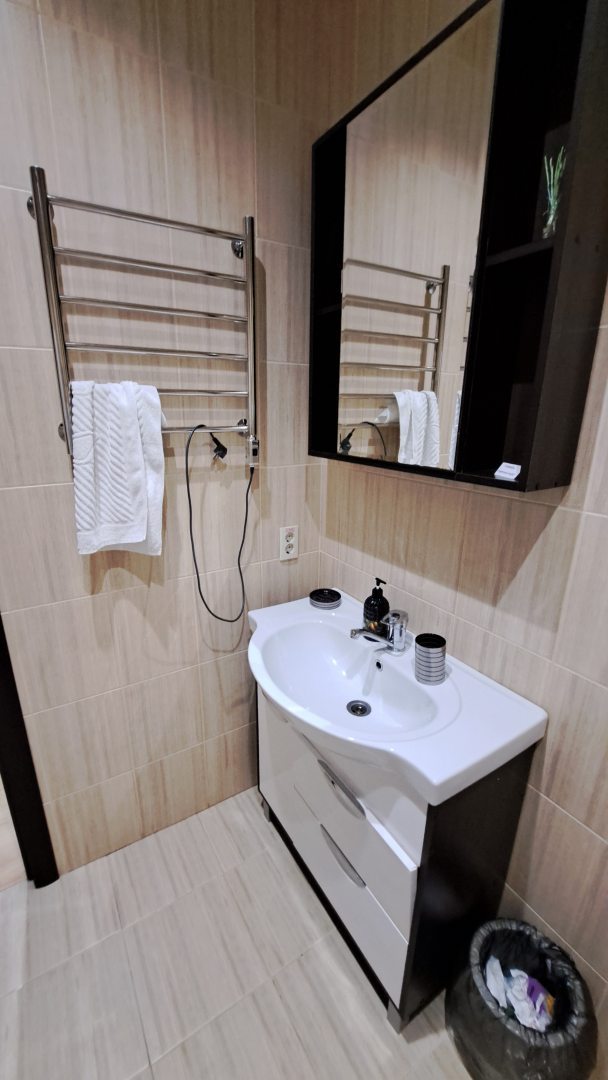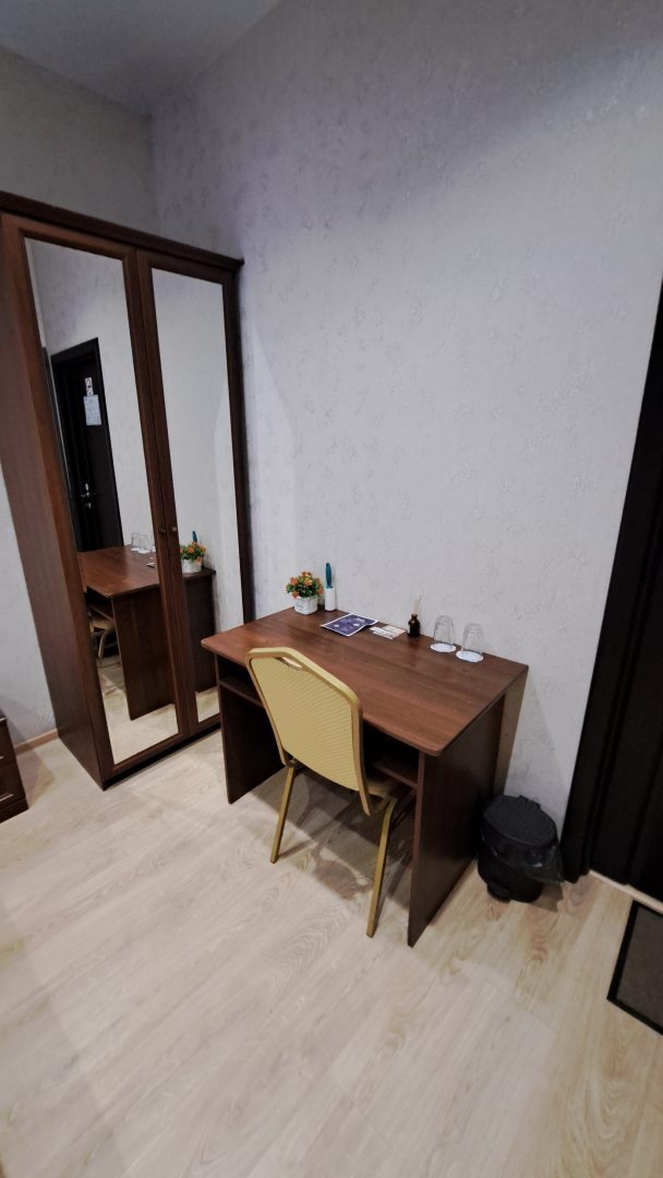 По номеру - он комфортен по размерам, есть где развернуться несмотря на одноместность, кровать удобная, матрас не продавлен, если бы не миллион звуков, я бы наверное выспалась!)) Горячую воду пришлось подождать - видимо нагреватель, но она была, и это прекрасно! Есть холодильник, чайник выдали по запросу, в холле есть кулер с питьевой водой. Есть пара стеклянных стаканов в номере. Кондиционера в номере не было (мне не критично, но вдруг кому-то важно), был вентилятор - включала перед сном (первые числа августа были жаркими) Телевизор рабочий (если это кому-то важно), сеть ловило только у окна, но тут пришёл на помощь вай-фай - работает исправно! Рядом с отелем есть продуктовые магазины и кафе.