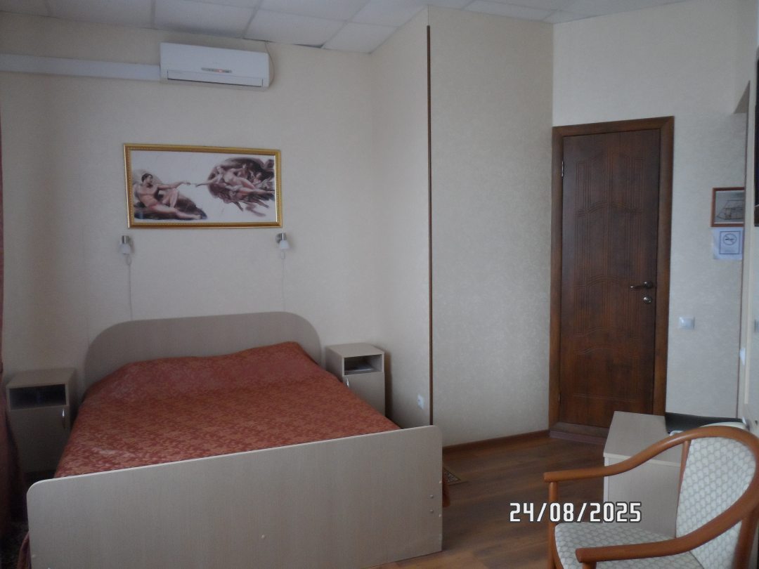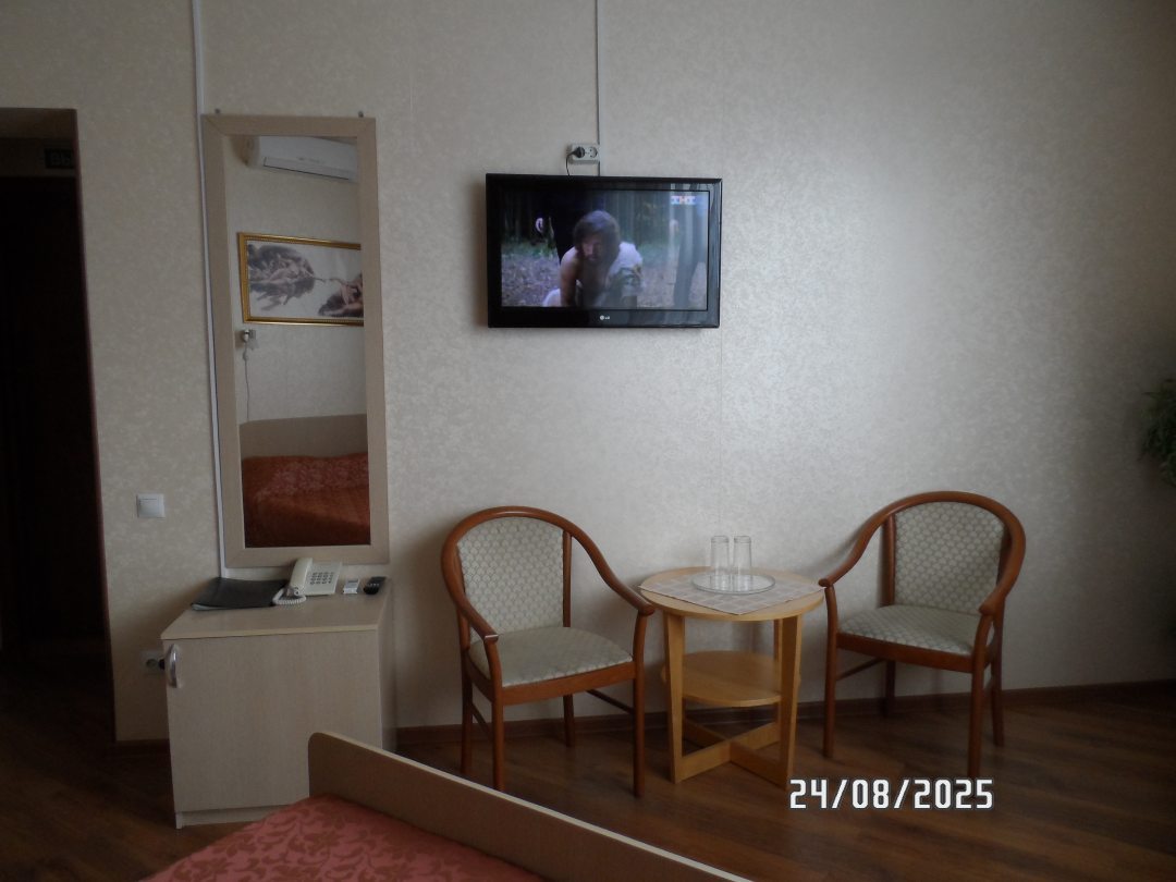 Гостиница находится в комплексе с центром развлечения (есть кинотеатр, ресторан, сауна с бассейном, вроде даже боулинг). Рядом парк победы, сквер, стадион, много магазинов, остановка транспорта. Приятно удивил номер, достаточно просторный и есть всё, что только возможно для комфортного отдыха холодильник, кондиционер, столик с креслами, торшер, множества розеток, маскитная сетка, светильники над кроватью, над зеркалом в туалете, удобный тропический душ, второе одеяло, подушка дополнительная в шкафу, есть второй комлект постельного белья и даже искуственный фикус. В номере всё очень достойно.