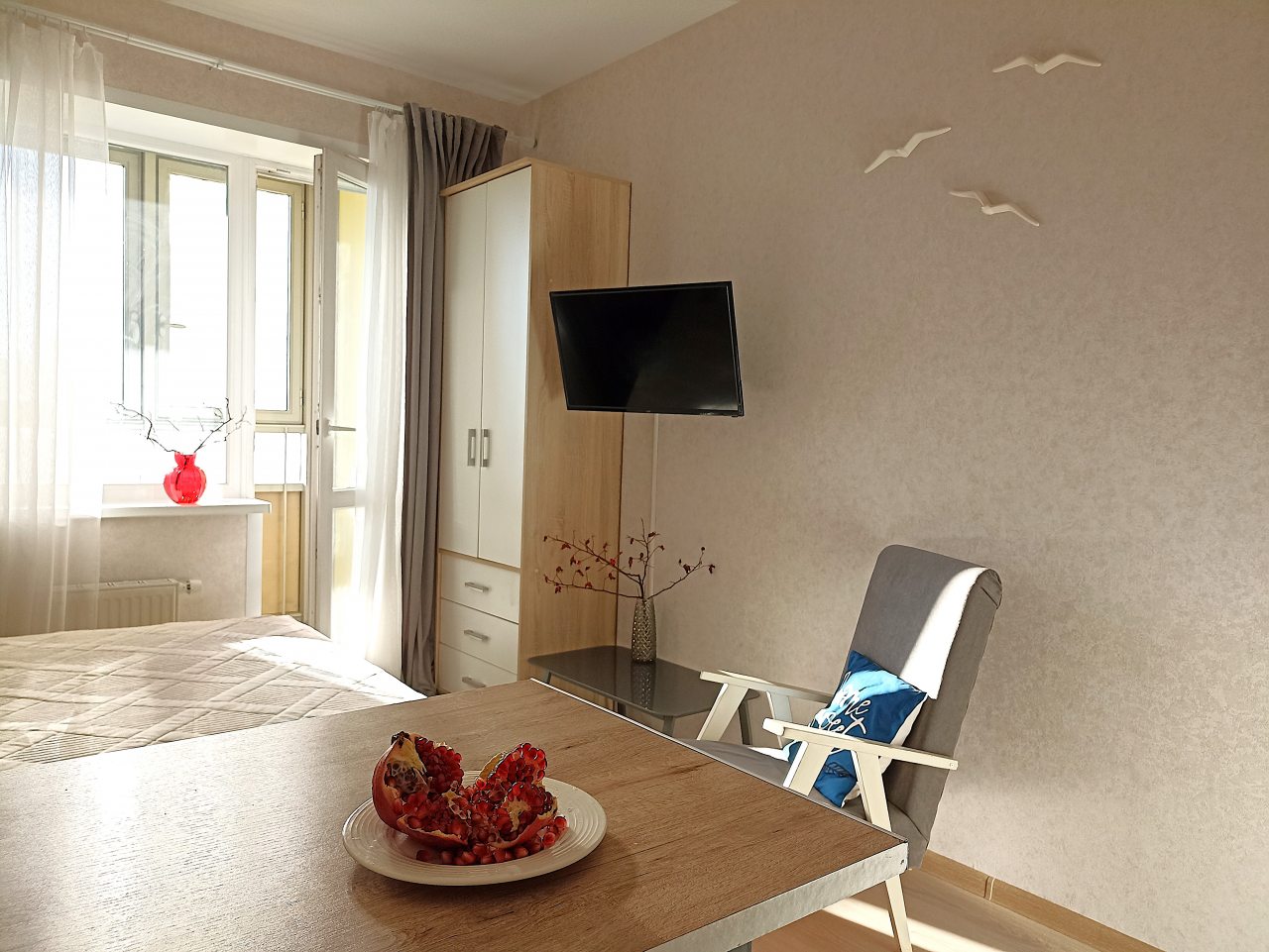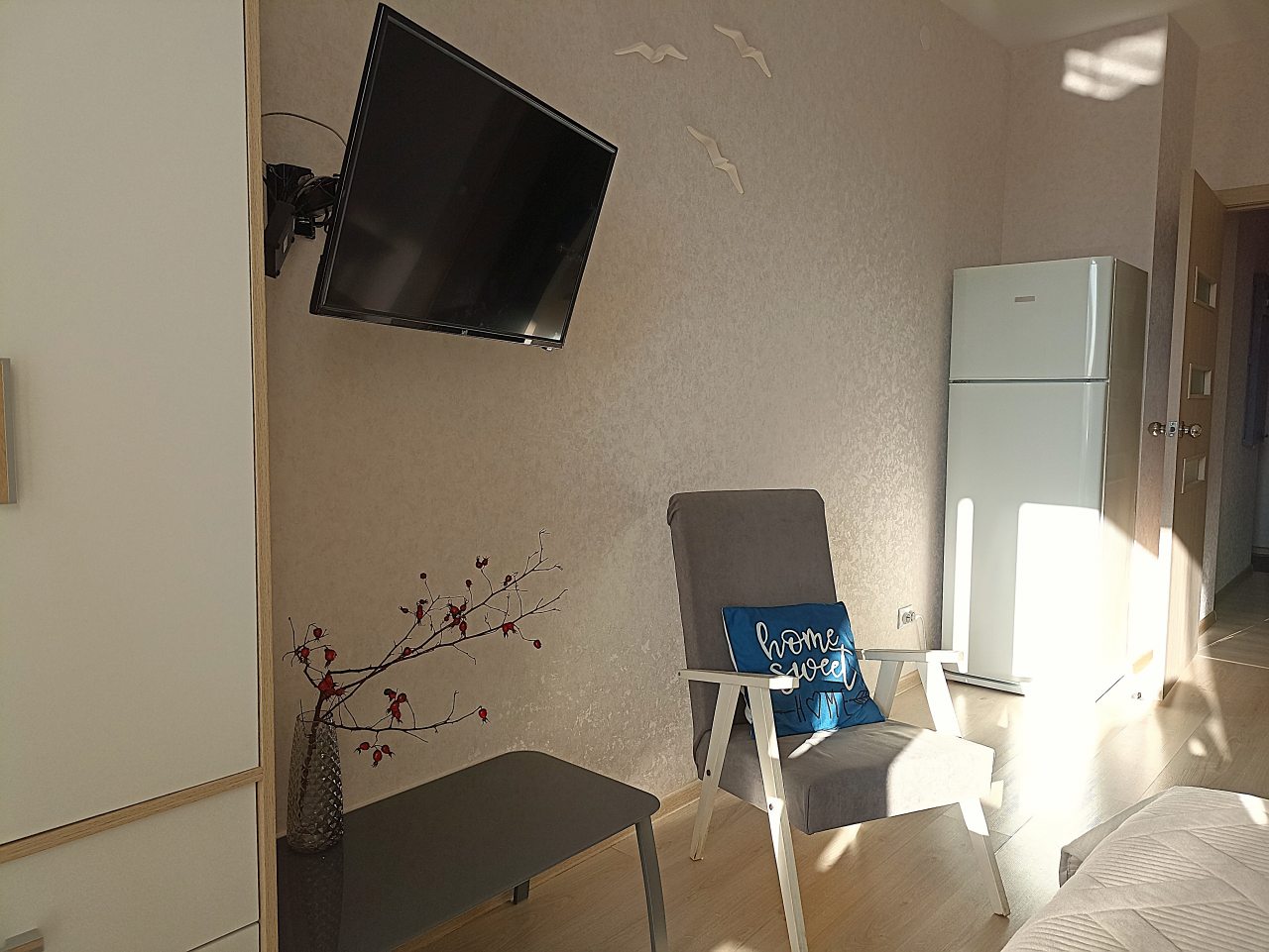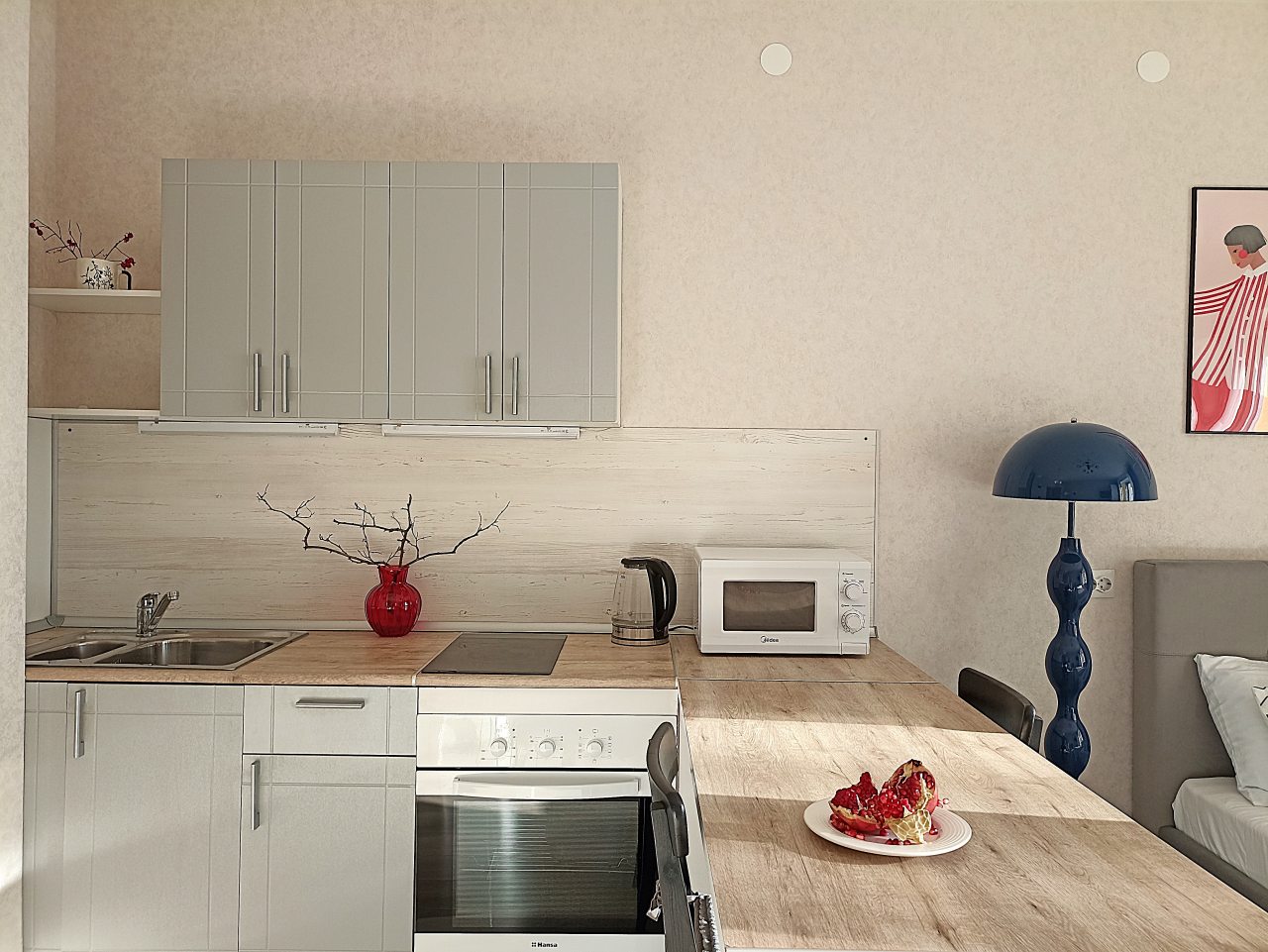 Есть все необходимые вещи, от посуды до стиральной машины. Спальное место удобное, подушки и матрас мягкие. Удобно, что в наличии мини-кухня с хорошей плитой. Просторная комната, много света, окна выходят на тихую улицу. Все удобно для долгого проживания, всё продумано.