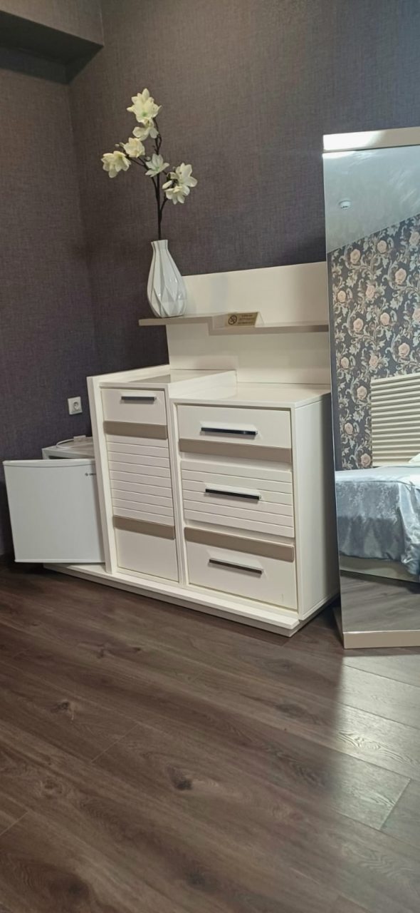 В номере имеется кровать, шкаф, тумбочка, мини холодильник, чайник, стол, собственная ванная