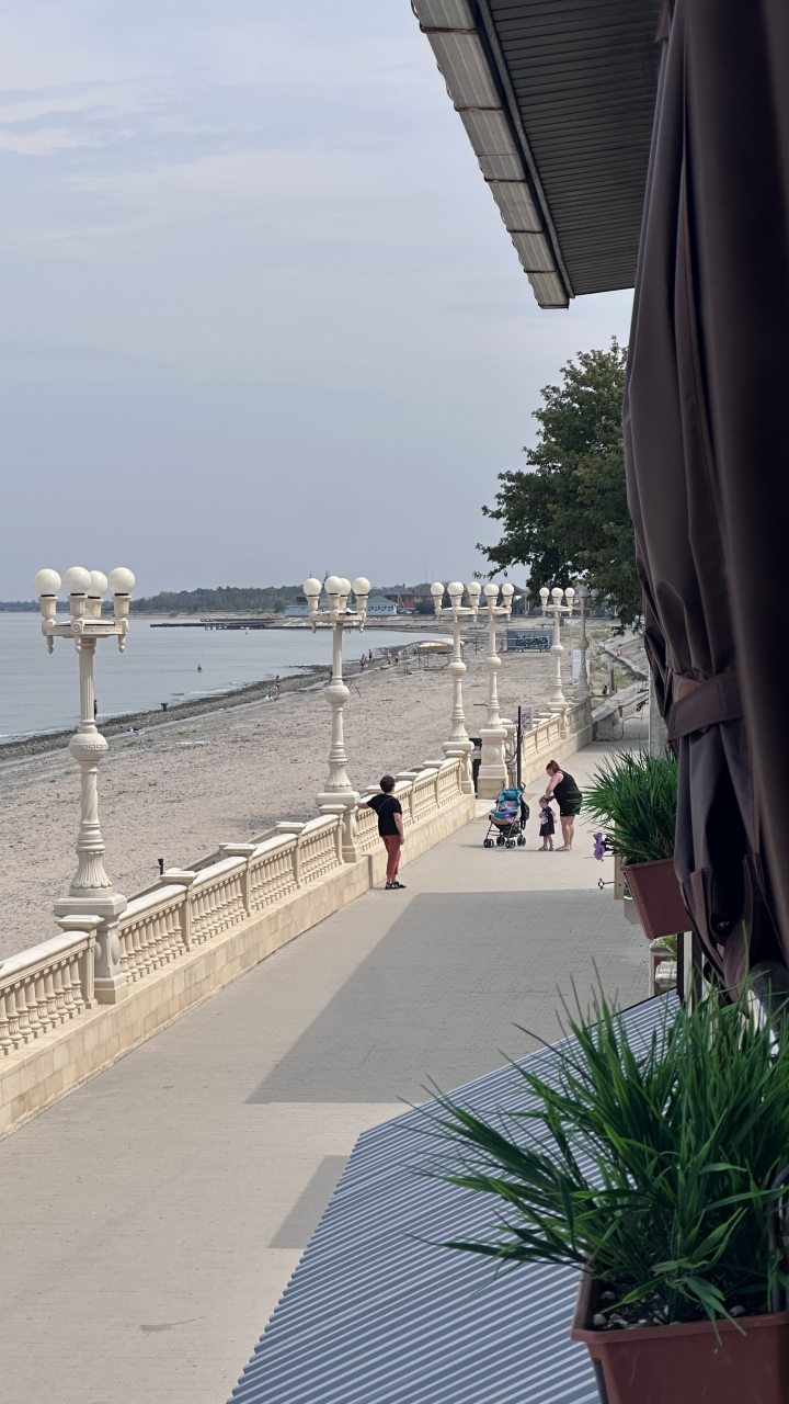 Отдыхали в этом отеле с 30.06-12.07 , бронировали номер за три месяца, брали самый недорогой, маленький на третьем этаже, но с видом на море из окна!!! В номере большая двуспальная кровать, есть холодильник, телевизор и кондиционер, все работало исправно и в пультах батарейки не сдохшие, свой санузел в номере, есть даже зубные наборы, полотенца есть, все чистое , номер убирали хорошо -по требованию, на этаже есть сушилки для полотенец, да, самое интересное, в санузле-всегда горячий змеевик (полотенцесушитель)! В отеле есть свое кафе, очень вкусная яичница и нам варили на заказ гречневую кашу, зерновой кофе всегда с утра брали, можно еду брать в номер! Очень удобно! Вечерами сидели на шикарной террасе этого отеля и встречали закат, очень романтично и красиво, я только за это бы выбрал этот отель, ни у кого на набережной нет у отелей такой террасы с диванами на 2 этаже! Сидишь высоко-глядишь далеко! Под террасой есть шашлычная! Шикарные чебуреки и шашлыки очень вкусные-рекомендую!