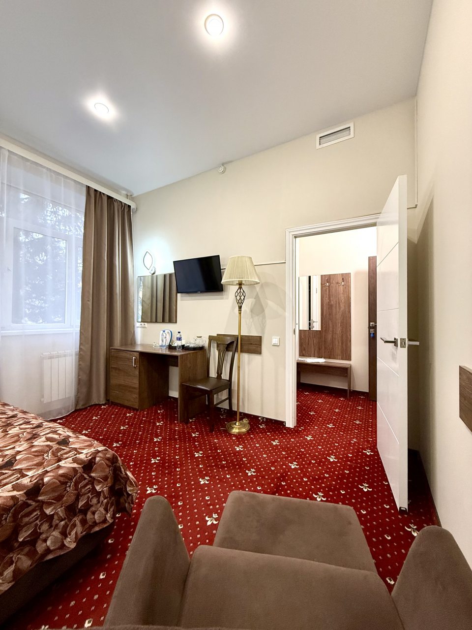 Неплохой отель, мы выбирали место для проживания недалеко от центра города. Номер заранее не бронировали, заселили нас сразу по приезду. Хорошая обстановка, мебель новая, ремонт свежий. Удобства в номере, очень чисто. Утром предложили завтрак, в ресторане можно заказать любое блюдо по меню, готовят очень вкусно.