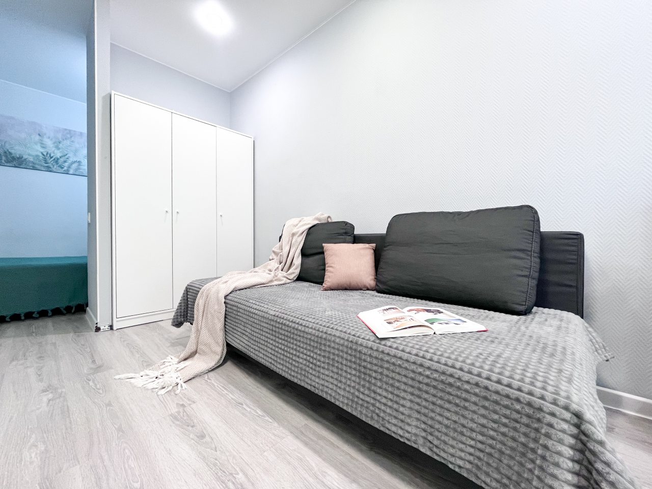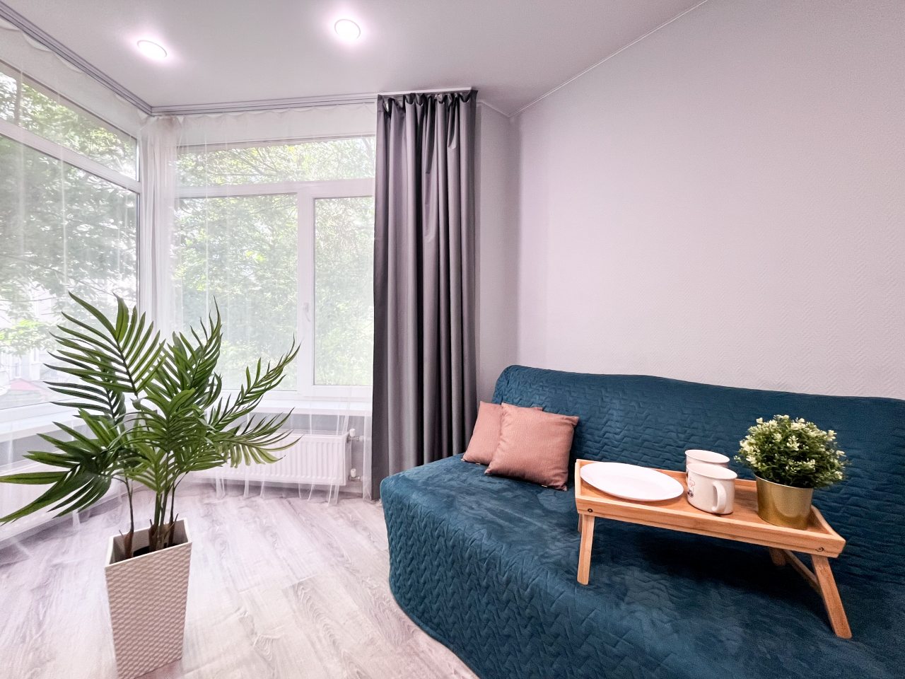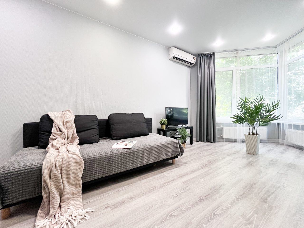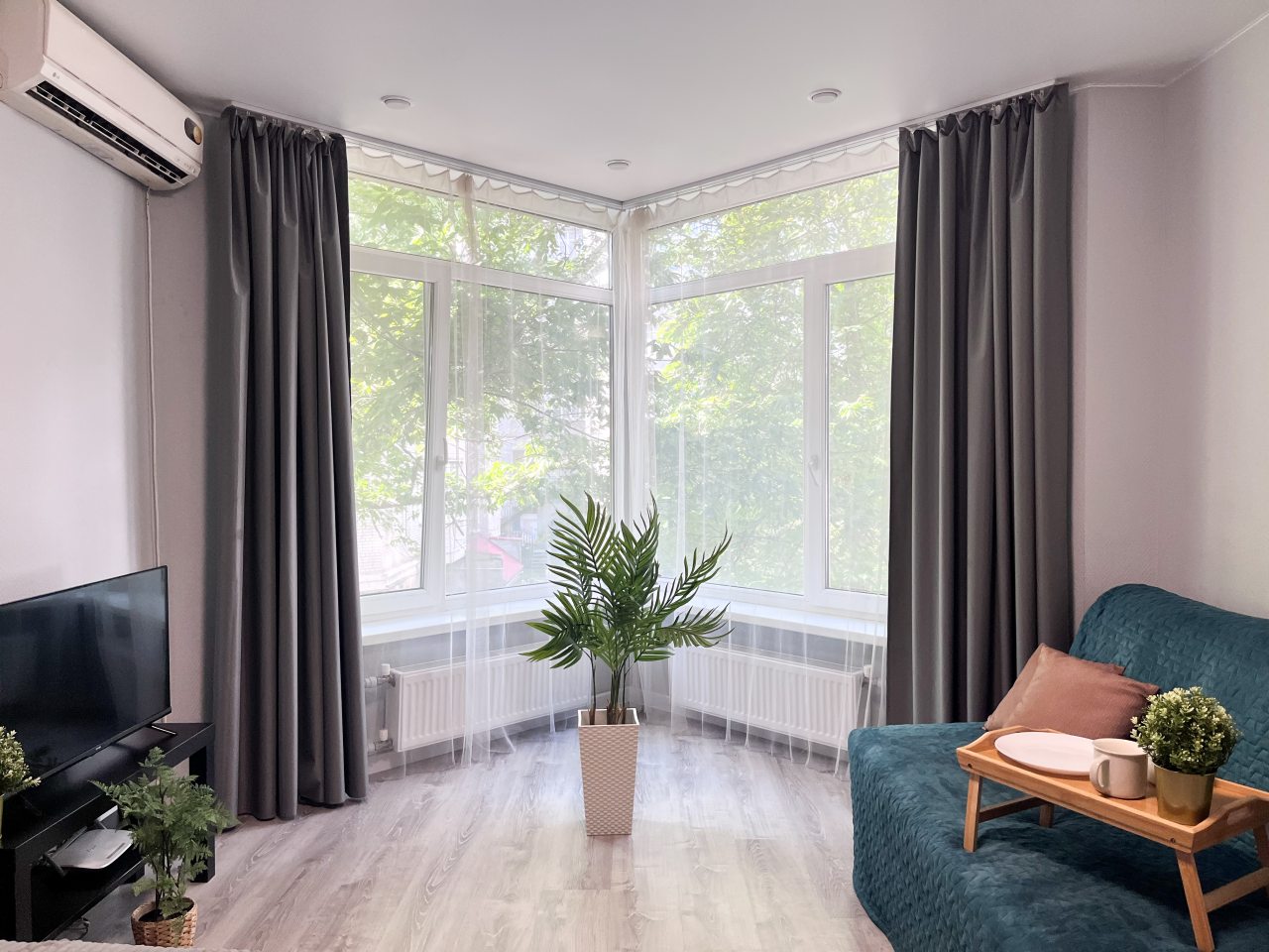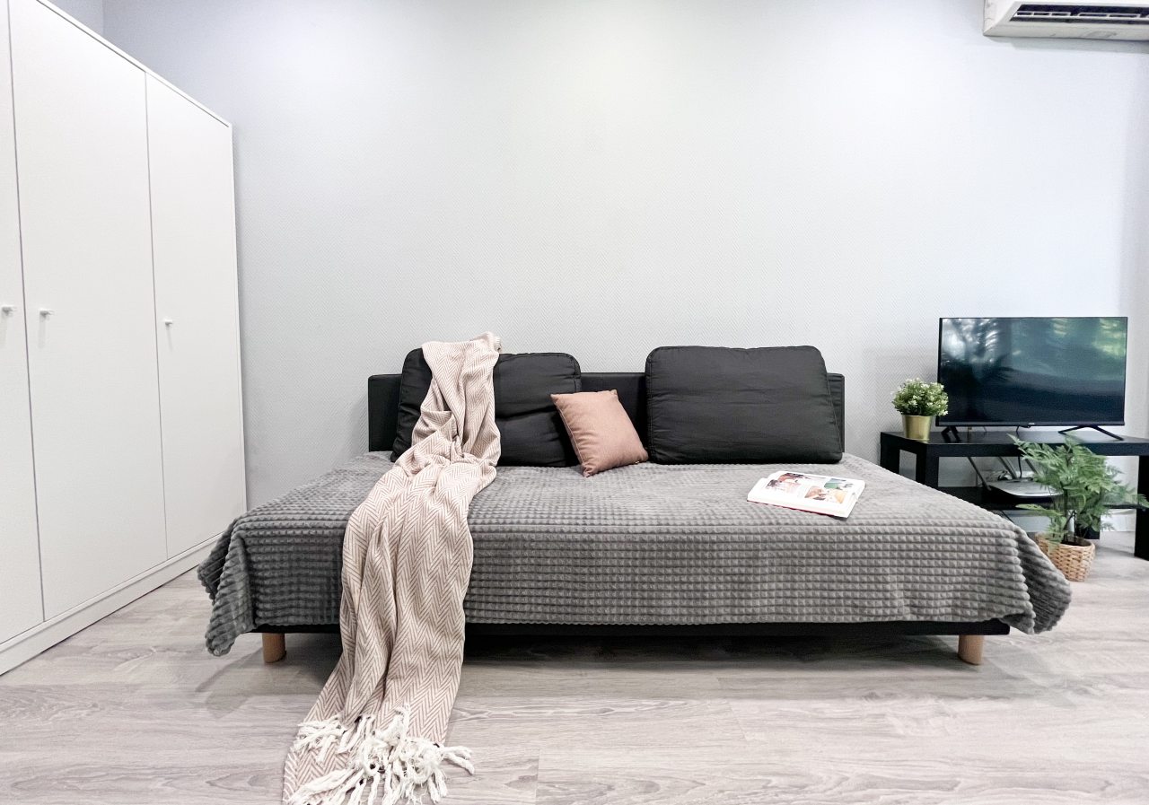 Квартира просторная и очень светлая, ведь в гостиной два больших окна, собранные в один угол. Подушки на кровати удобные. Не проваливаешься в них, да и качество хорошее. Санузел совмещенный, в нем есть ванна, но вот унитаз размещен слишком близко к ней. Кухня понравилась, практичная и по габаритам хорошо.
