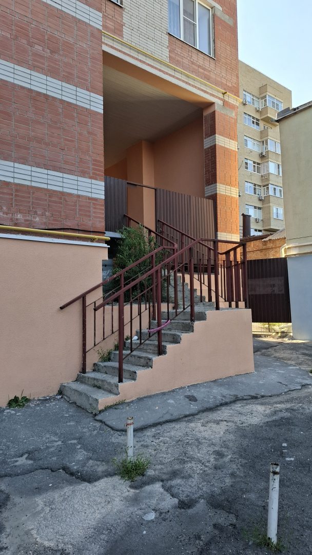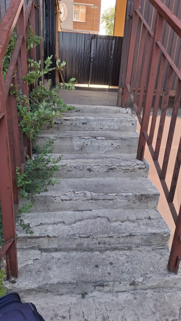 Вход с заднего двора по лестнице с полуветхими ступенями, с чемоданами не очень удобно.