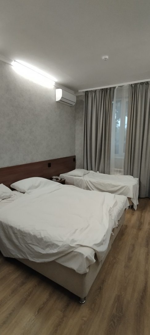 Были проездом из Нижнего Новгорода в Анапу! Забронировали на 101 hotels с безумно приятной скидкой! Приехали в отель ночью, нас встретили вежливо! Все рассказали, показали! Чистое, как мне показалось даже накрахмаленное белье! В номере две двухспальные кровати (что странно, так как приехали вдвоем с мужем) и одна односпальная! Телевизор, холодильник!