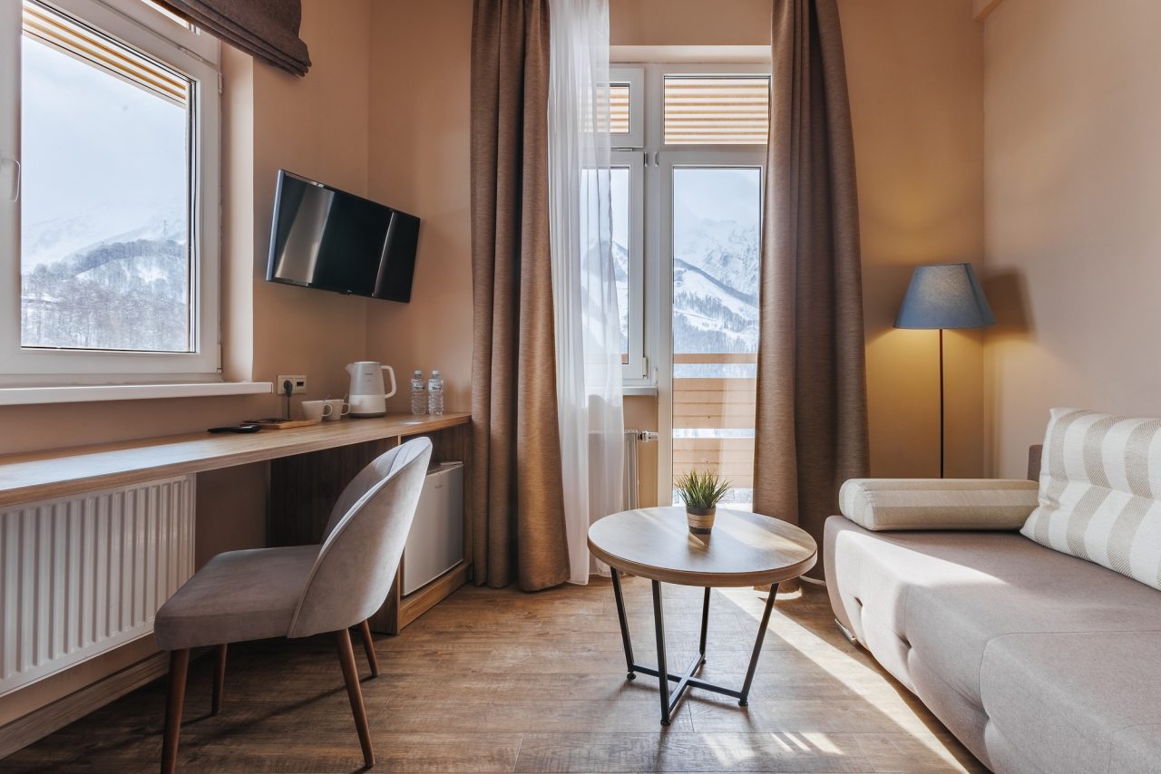 В обычном номере тоже есть огромный балкон и вид на горы, как и в видовом. Канатка безлимитная вниз к Ратуше на сутки 150р для постояльцев. Билет на ресепшене. Окна у 1 комнатных смотрят в 2 стороны, как и балкон.