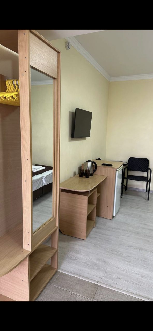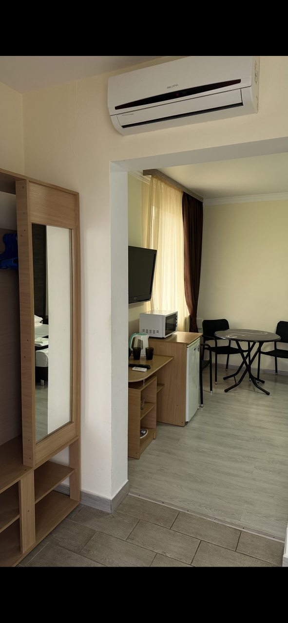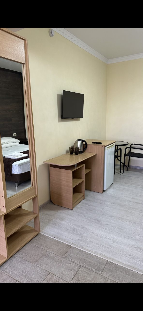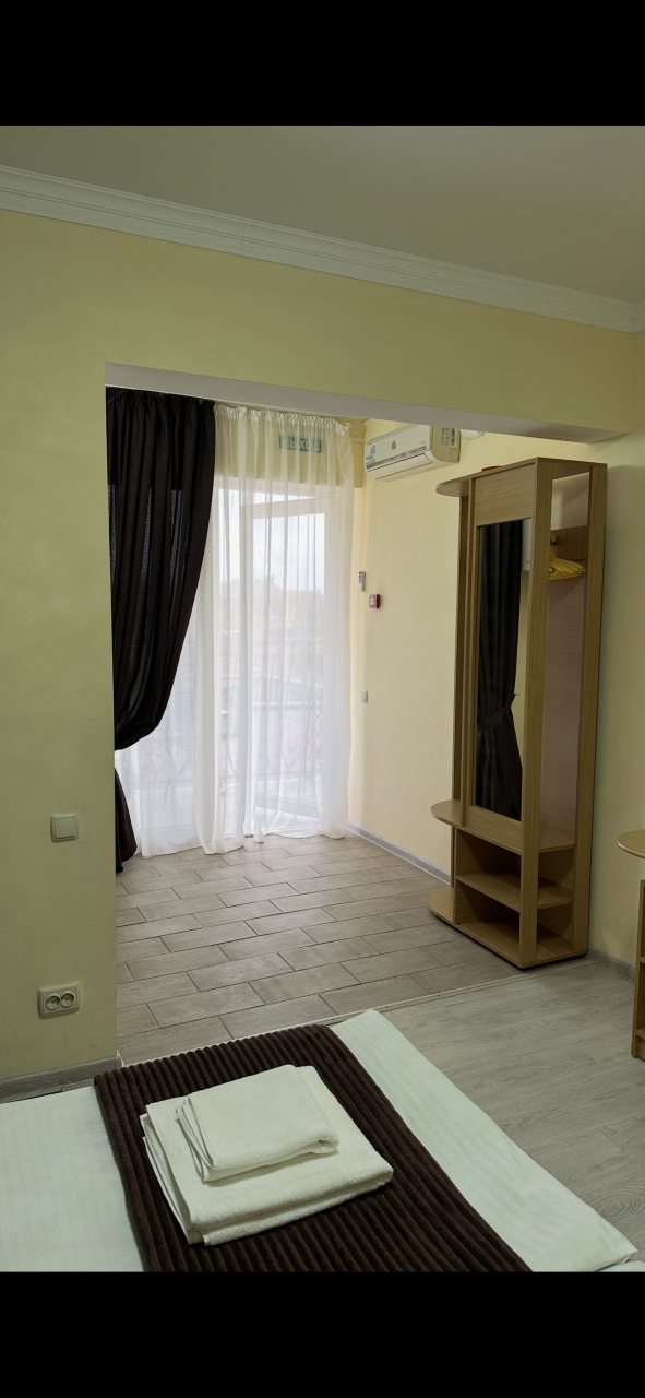 Плюсы: до моря реально 50 метров, есть кондиционер в номере, холодильник, чайник. Номер небольшой, но уютный. Для отдыха на море больше и не надо.