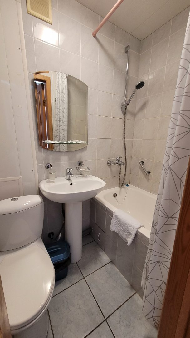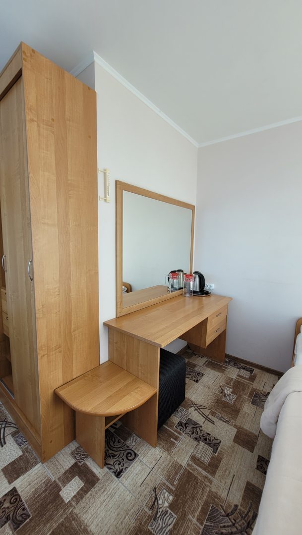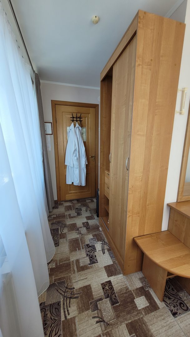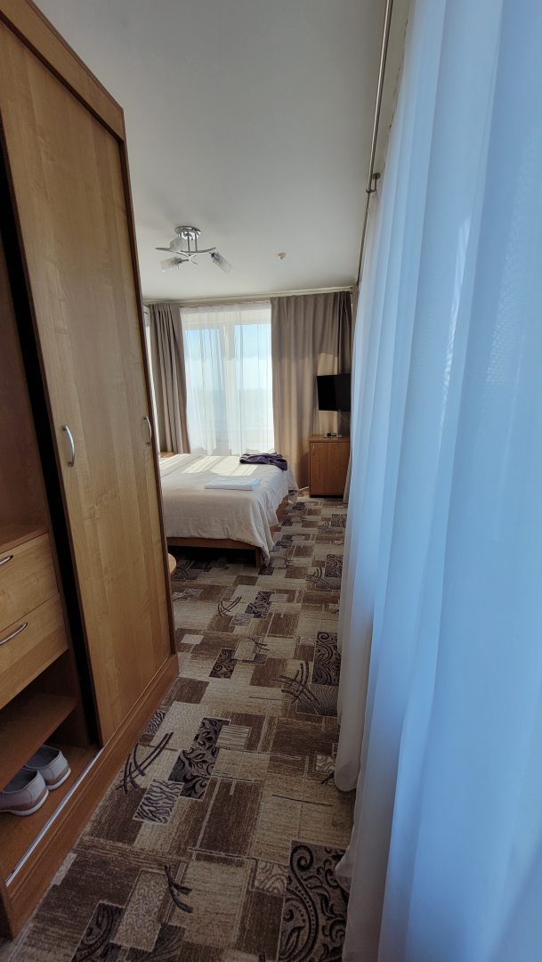 Хорошая трёшка старого фонда. В номере чисто, вполне уютно, есть всё необходимое, даже халаты, хотя тапочек не было. Кулер с водой на этаже. Большой плюс номера - это панорамный вид. И сам номер был на 11-м этаже. Всегда прошу этаж повыше. Персонал вежливый, приветливый.