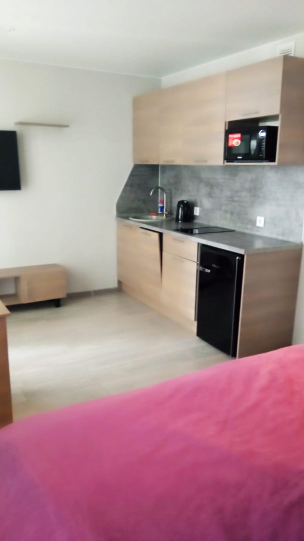 Минусов мы не обнаружили. Нас встретил вежливый персонал, поселили в чистый номер, а кухня оказалась полностью укомплектована: посуда, плита, микроволновка и даже посудомоечная машина. Отдельное спасибо за помощь с нашим крупногабаритным багажом — его без проблем разместили в комнате хранения. Что касается локации — здесь всё идеально: в шаговой доступности метро, а вокруг множество продуктовых магазинов, пекарени и кофейни.