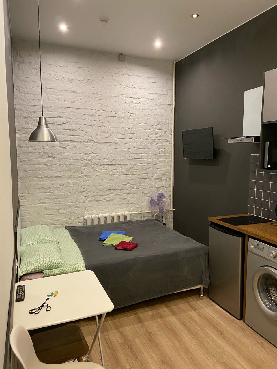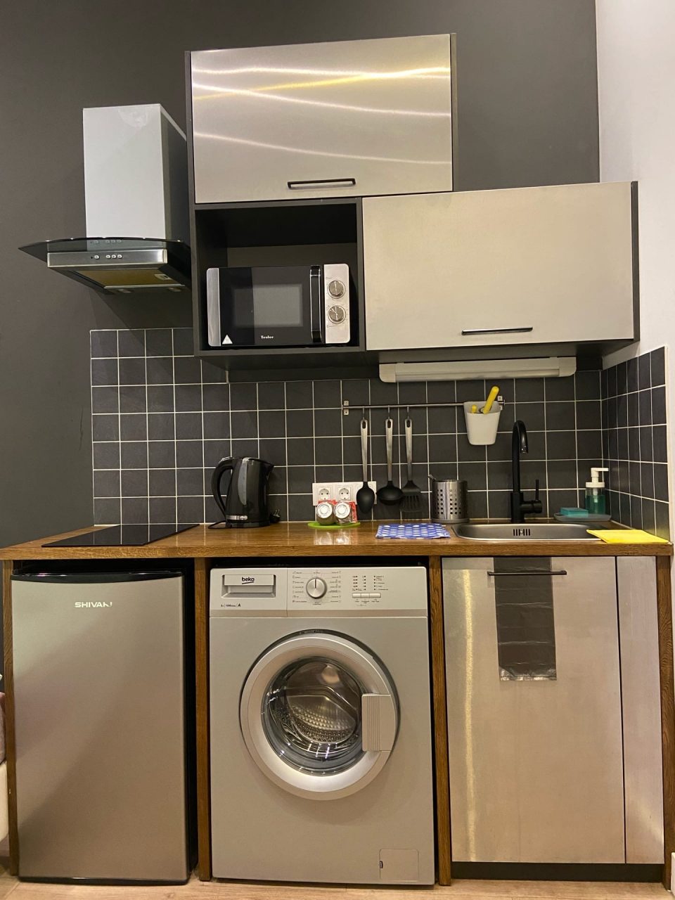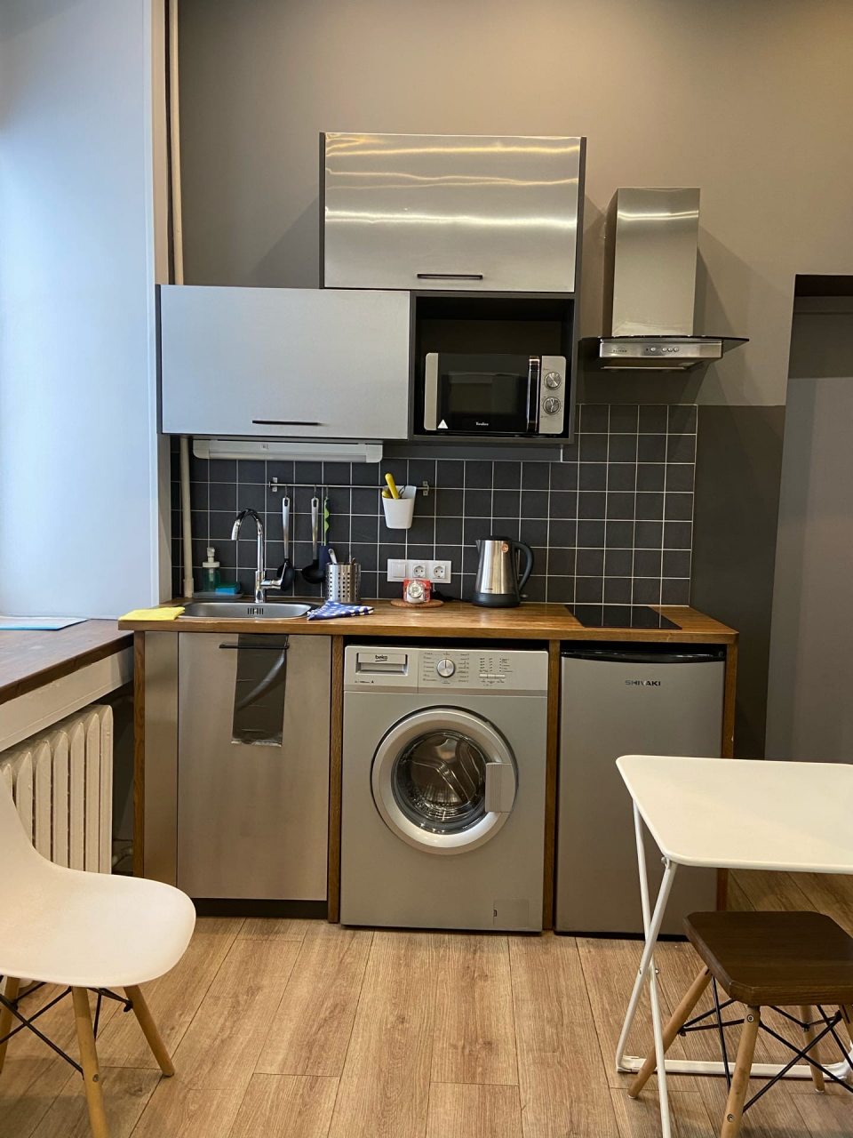 Хорошее место расположение, рядом метро. В номере есть всё необходимое (стиральная машина, электрическая плита, чайник, микроволновая печь, мойка, утюг, телевизор, гладильная доска.