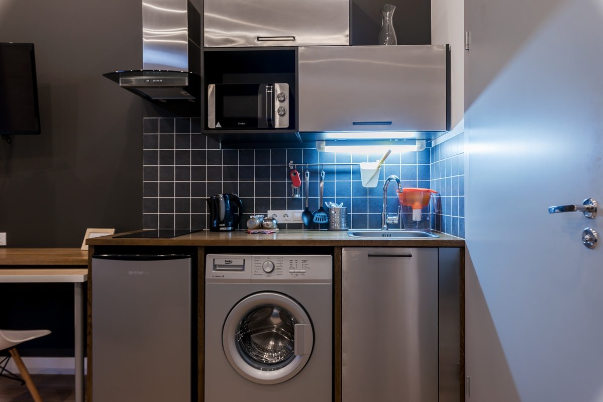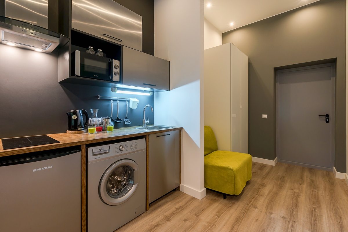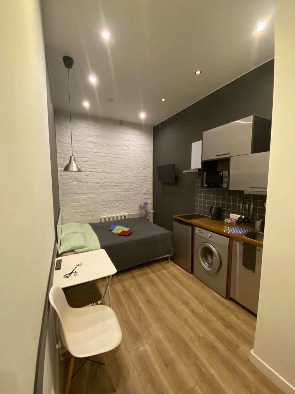 Хорошее место расположение, рядом метро. В номере есть всё необходимое (стиральная машина, электрическая плита, чайник, микроволновая печь, мойка, утюг, телевизор, гладильная доска.