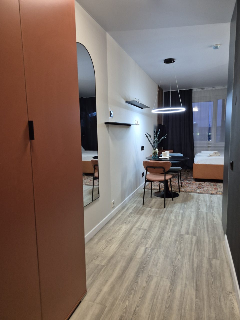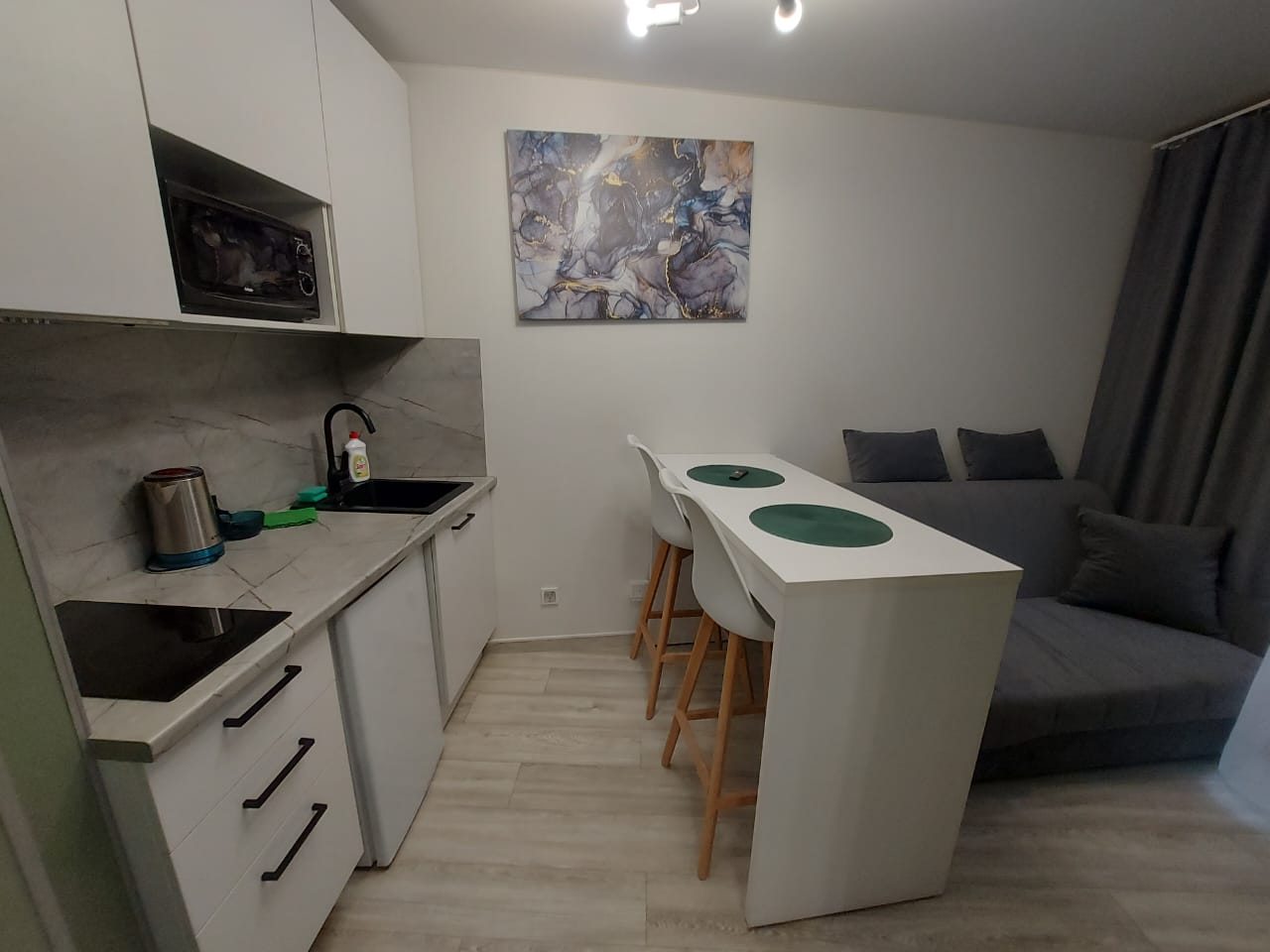 Очень рад, что выбрал именно эти апартаменты для проживания! Квартира с современным и стильным ремонтом, техника и мебель новая, даже небольшая оборудованная кухонная зона есть.