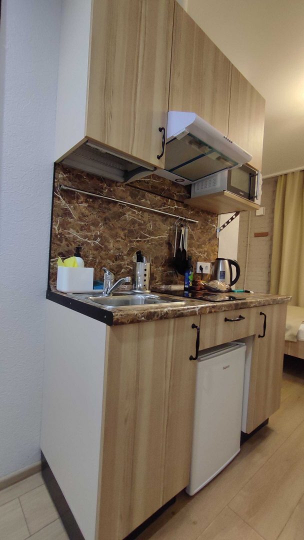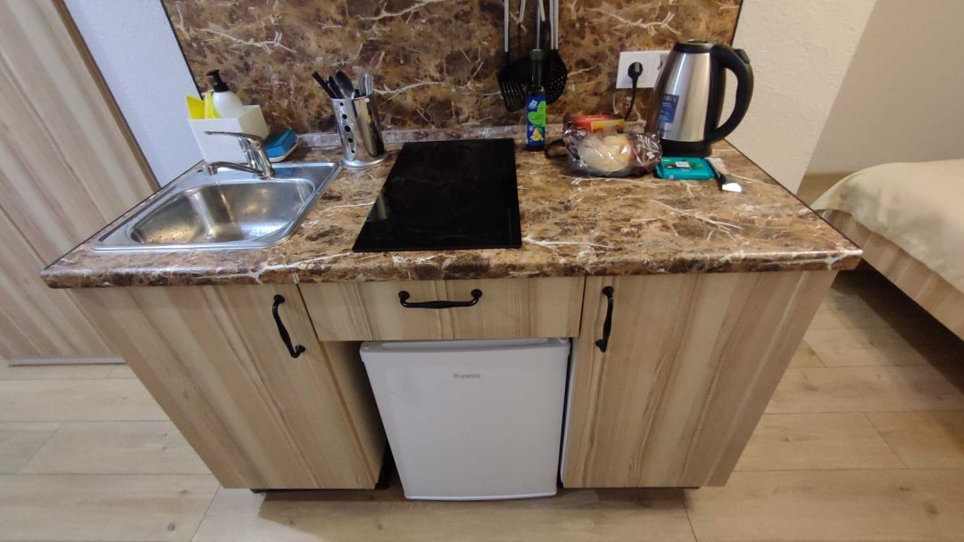 Для такого бюджетного варианта очень понравилось. Номер маленький но чистый. Есть кондиционер и миникухня со всем необходимым (электрический чайник, микроволновая печь, плита, холодильник, посуда, включая сковороду и кастрюлю). Вместительный шкаф на входе. Звукоизоляция не очень, но было тихо и ничего не мешало.