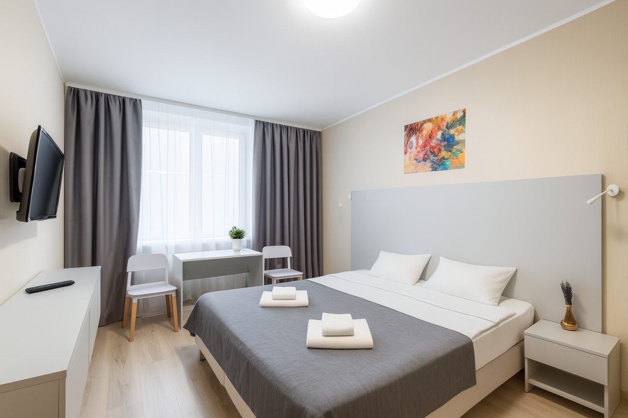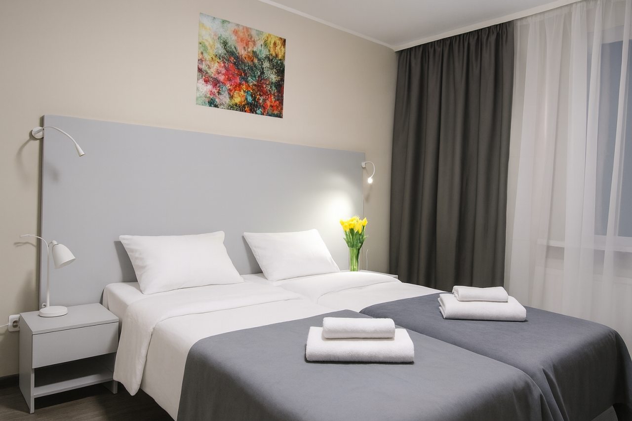 Снимали апартамент в этом отеле (полноценная однокомнатная квартира) Место хорошее, транспортная доступность хорошая, все чисто, уютно, есть все необходимое для проживания, от одноразовых принадлежностей в ванной комнате до необходимой посуды и пряностей в кухне. Одноразовые тапочки, гладильная доска, фен, утюг, все это было в квартире. Отличный сон был обеспечен, благодаря окнам с выходом во внутренний двор, хорошему матрасу и прекрасному пастельному белью (кстати натуральному хлопковому).Рядом (сразу напротив) большой перекресток магазин, где есть все все, там же бесплатная круглосуточная парковка для автомобилей. Это важно для СПб, как мы теперь выяснили :)