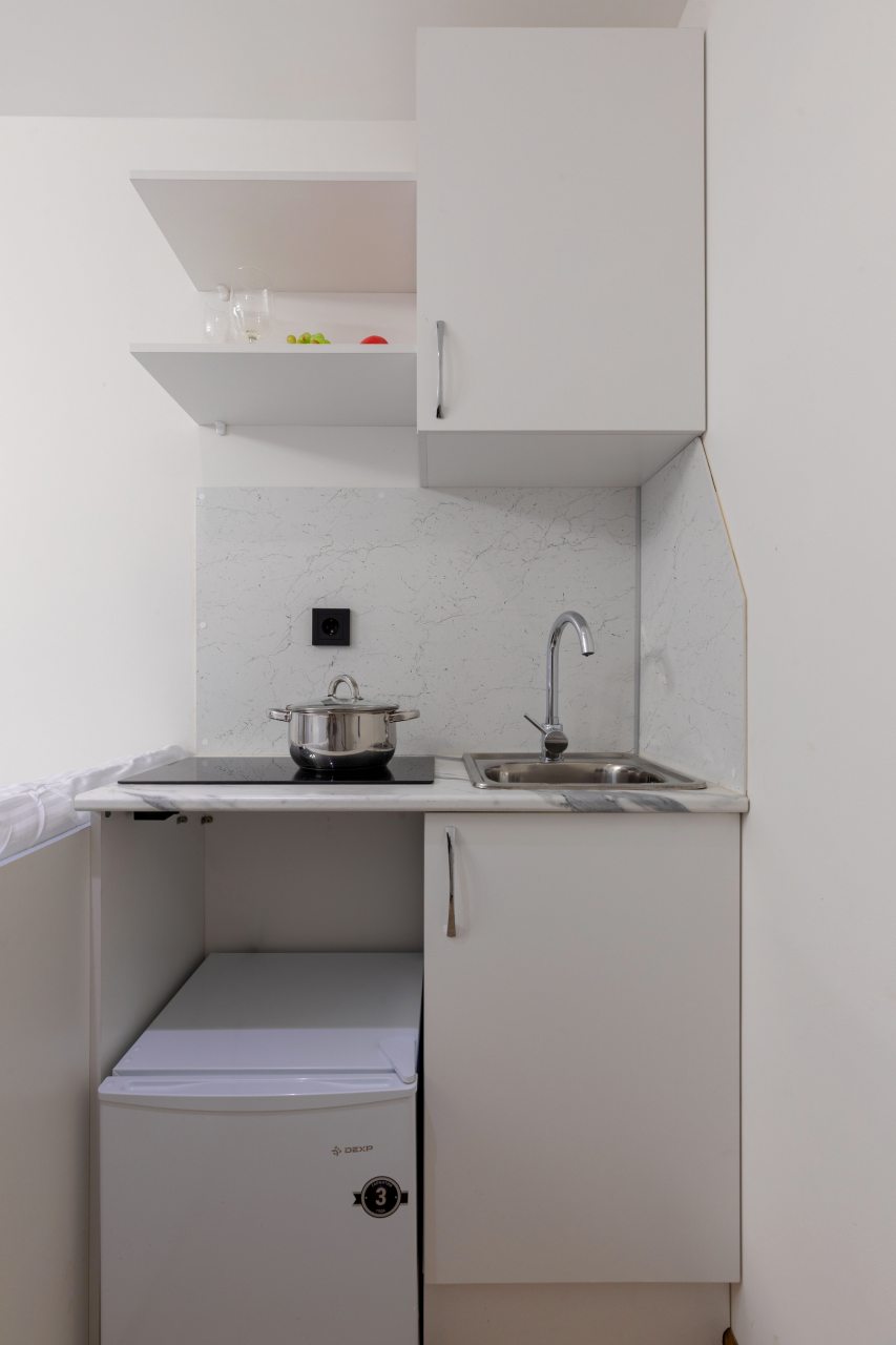 Маленький номер, но для одного человека сойдёт, есть откидной столик, мини плита, посуда, раковина, фен, и достаточно большая кровать, есть небольшое полуподвальное окошко