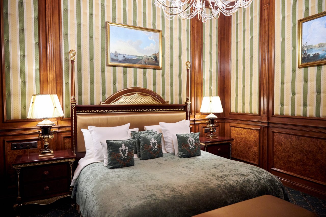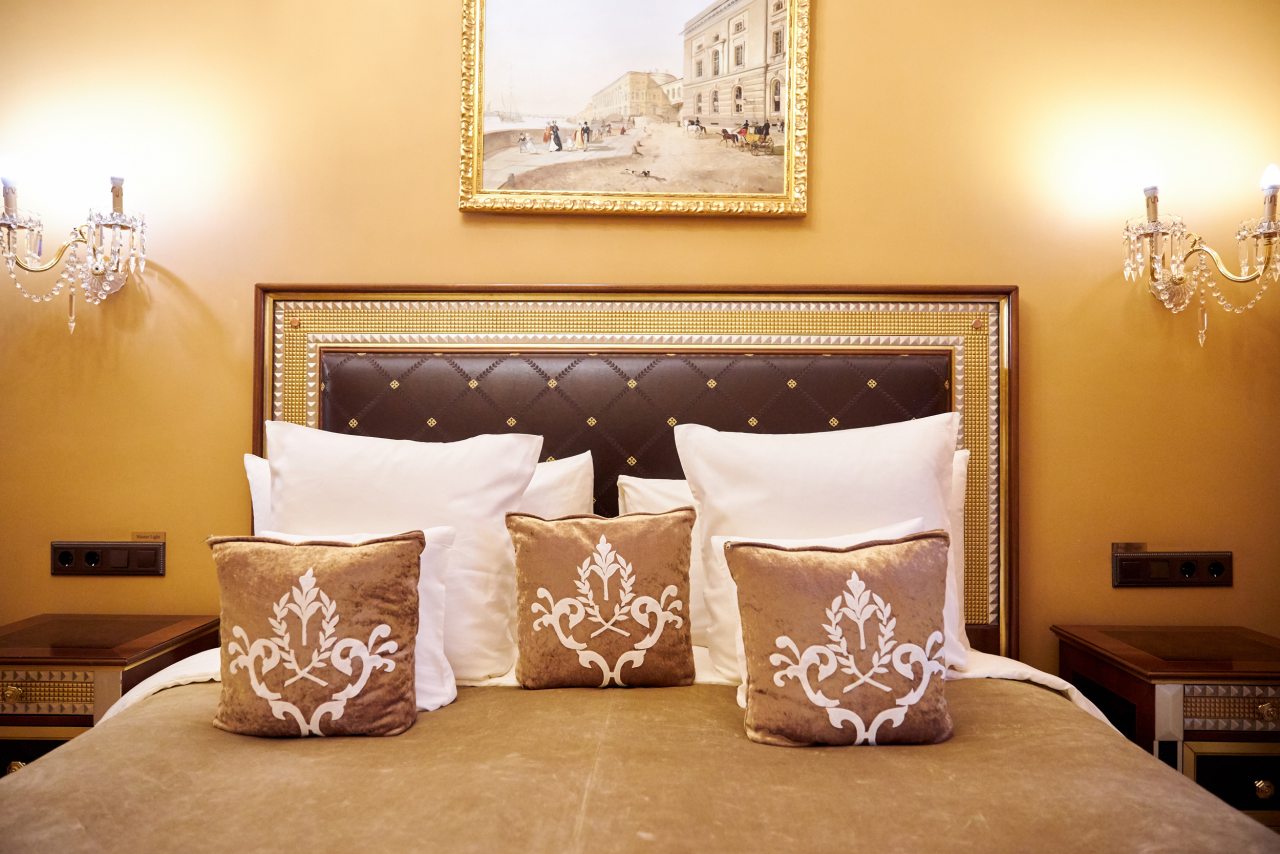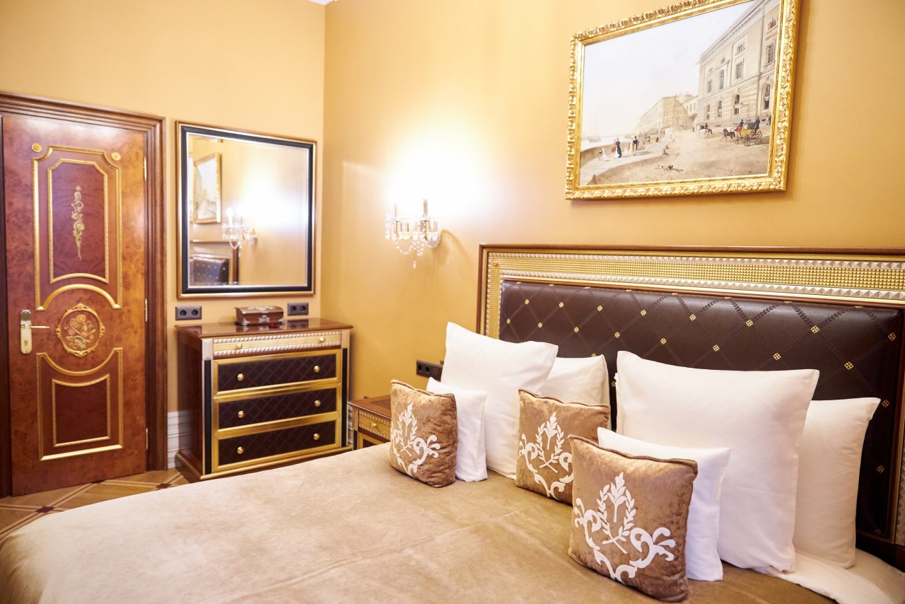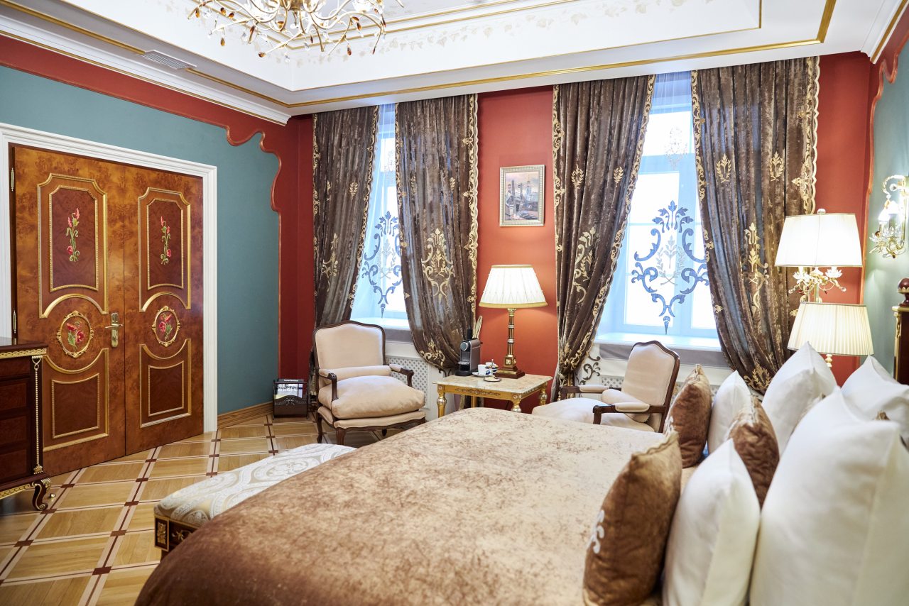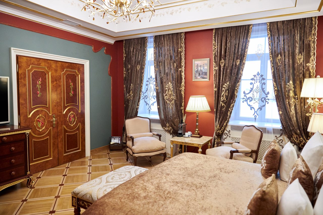 Отель очень приличный! Пять звезд однозначно! Очень хороший персонал, всегда готов во всём помочь. Отель внутри очень похож на дворец, приятно радует глаз и интерьеры и убранства. Номер замечательный. Постельное бельё шикарное, итальянское. Мебель изумительная, красивая. Всё работает и климат контроль и инженерные системы. Ванная комната соответствует всем европейским стандартам. На ночь окна можно закрыть плотными шторами и белые ночи не мешают спать. В отеле очень тихо. Ресторан приятно удивил настоящей русской кухней. Очень вкусно, даже есть хреновушка. Это хорошая настойка на хрене. Завтраки также хорошие и разнообразные. Мы проехали многие станы, более 50 , бывали в разных пятизвёздочных отелях. Этот отель несомненно вошёл в лучшую десятку отелей мира. Рекомендую любителям дворцовой аутентичности и семьям с детьми. Тишина и уют. Можно с собачками.
