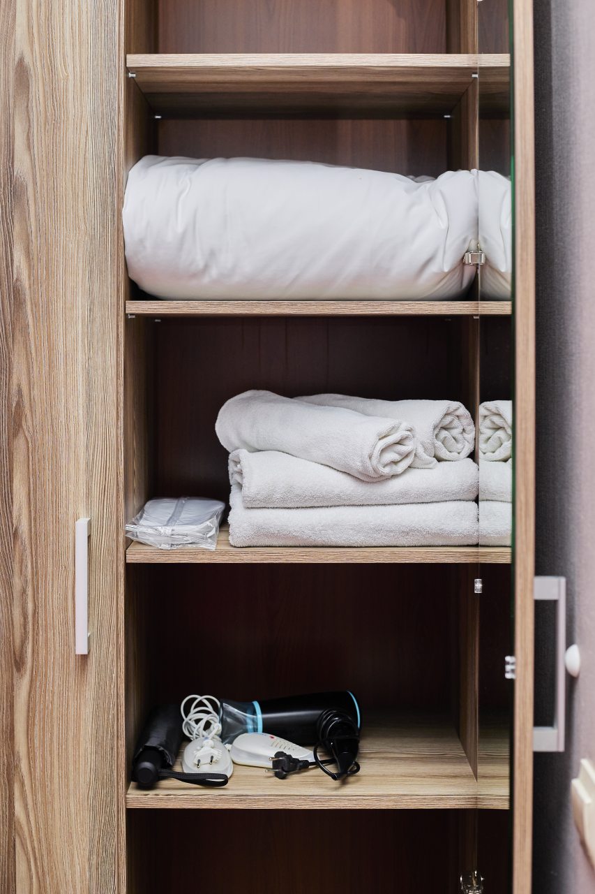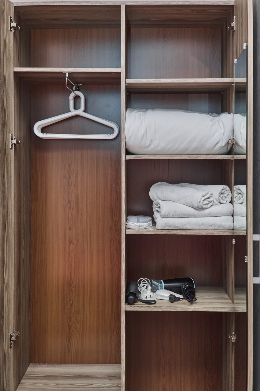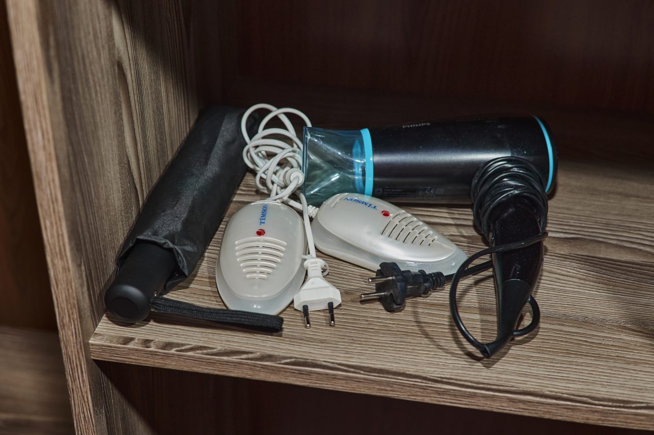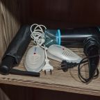 На стойке есть чайник, кофе машина, гладильные принадлежности.