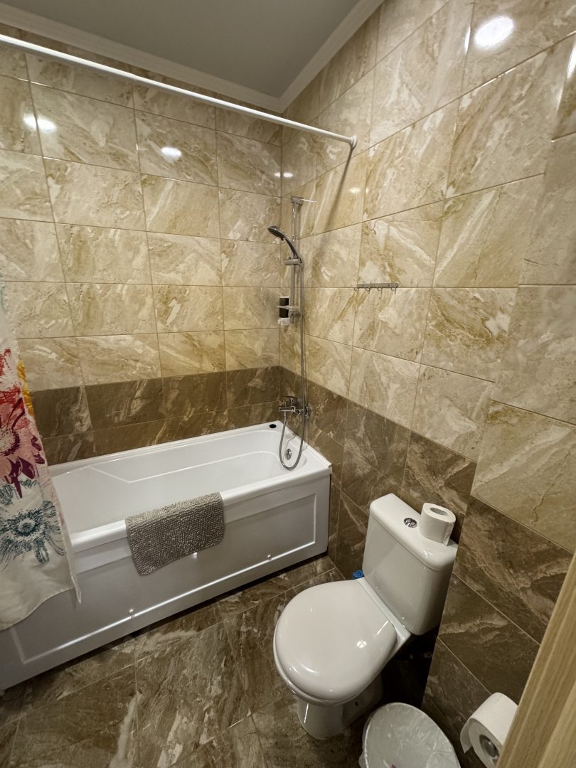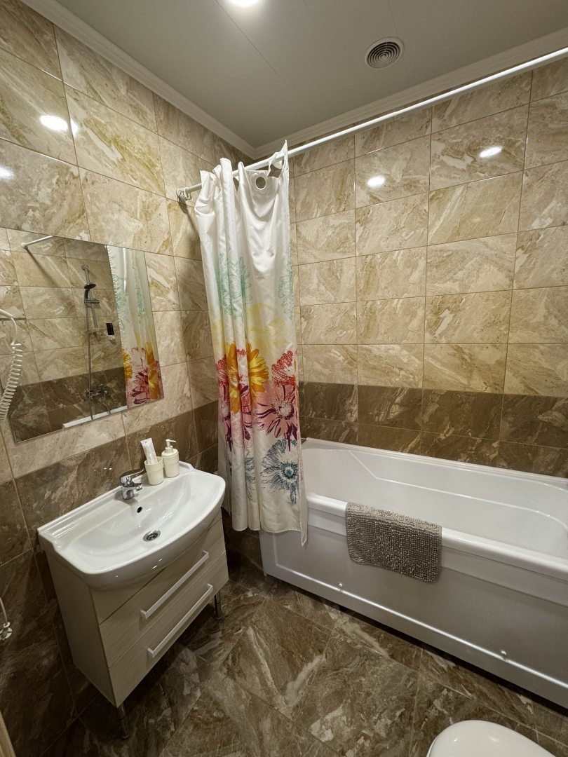 Из недостатков: новая мебель ванной (тумба раковины) 2024г испорчена водой от попадания при незакрытой шторке(надо было и бок делать ламинированным)