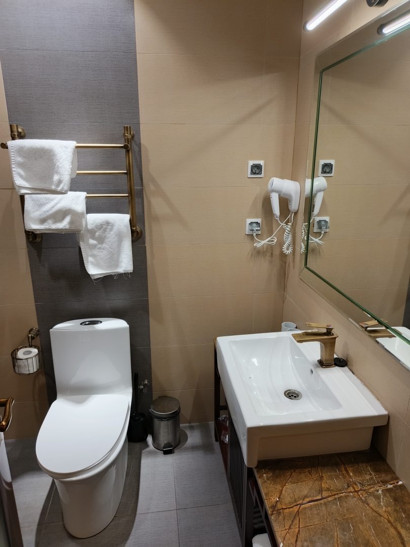 Из недостатков: в душевой кабине занавесочка не первой свежести и очень короткая. Вода растекается и за пределы душевой кабины. Желательно освежить и удлинить.
