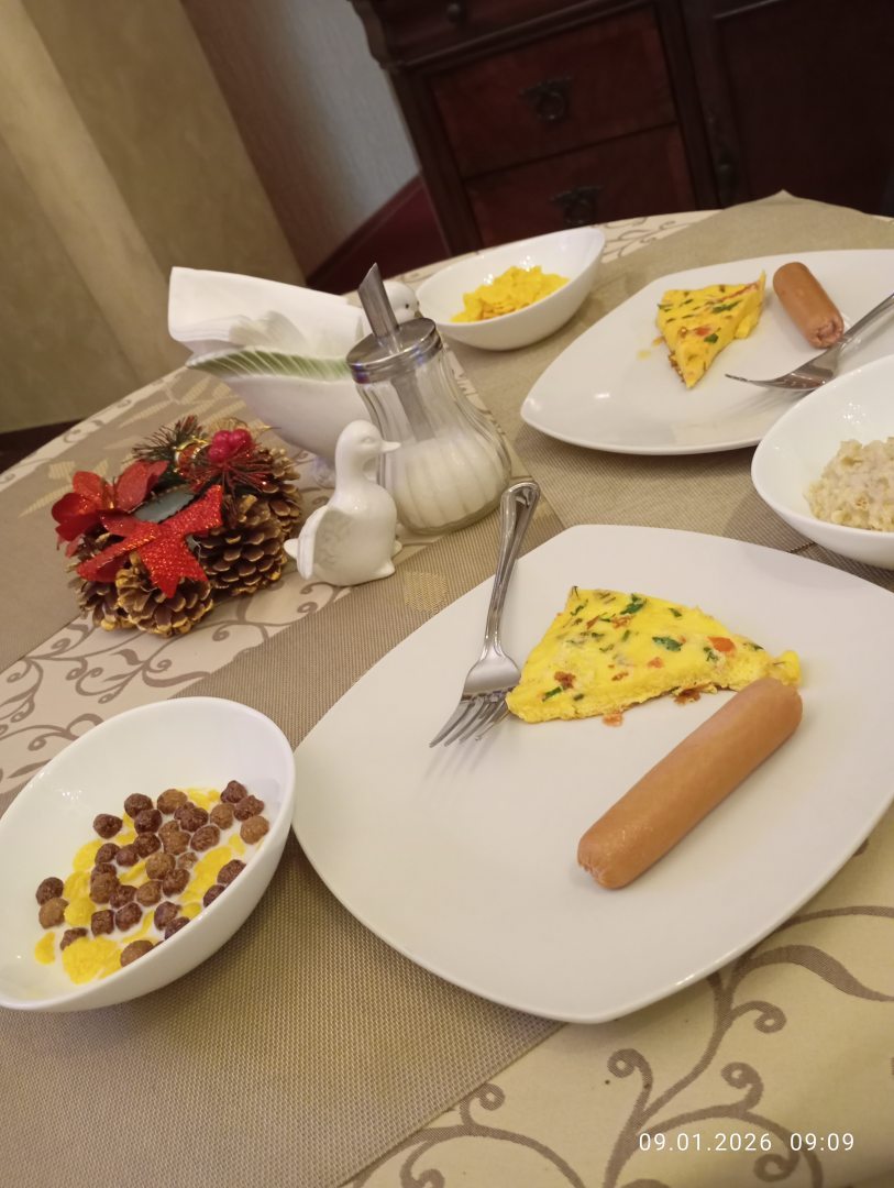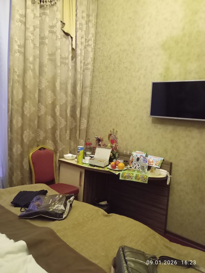 Проживали в номере стандарт,тихо уютно.В номере есть мини холодильник ,смарт ТВ,стол,стул,кровать тумбочки,шкаф,зеркала, шкаф,графин,стаканы, обогреватель. Собственная ванная с мыльными принадлежностями.Администраторы-девочки очень отзывчивые,выдали тапочки,халаты, по просьбе вазу. Завтрак нормальный, в холле три стола, кулер, посуда,которую можно брать в номер. чайные пакетики. Вещи можно после выезда из номера оставить на хранение.