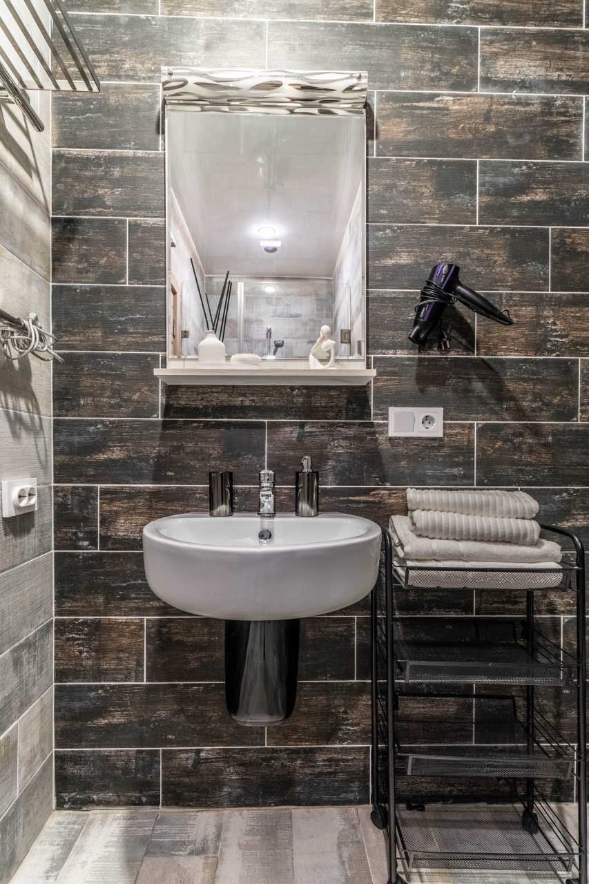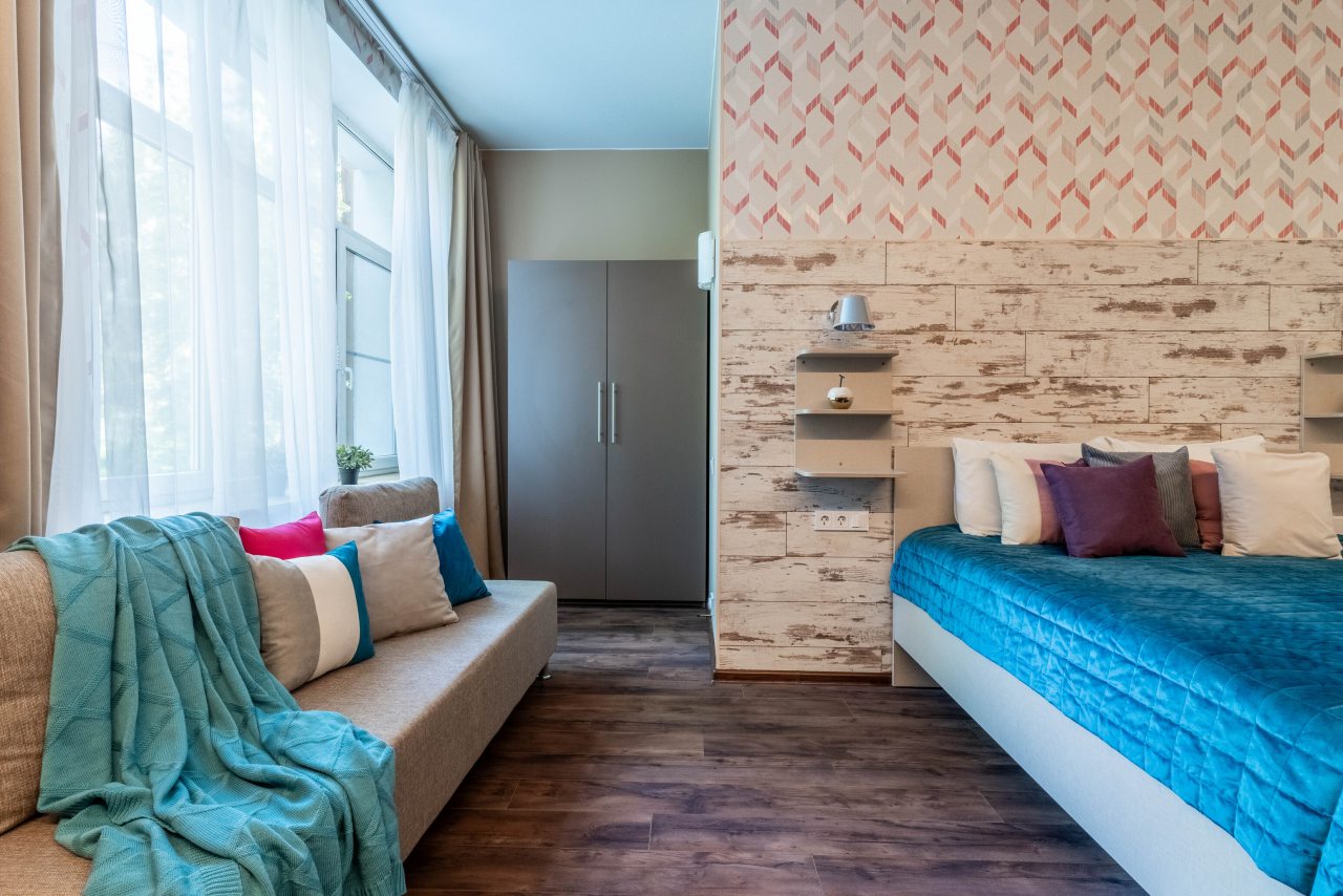 Апартаменты с хорошим ремонтом. Мы жили здесь больше 4-х дней, когда приезжали на личном автомобиле. Парковка здесь есть. Номер брали двухместный с одной кроватью. По площади он небольшой, но есть и свой санузел, хорошо оборудованный, и небольшая зона кухни. Мы остались довольны.