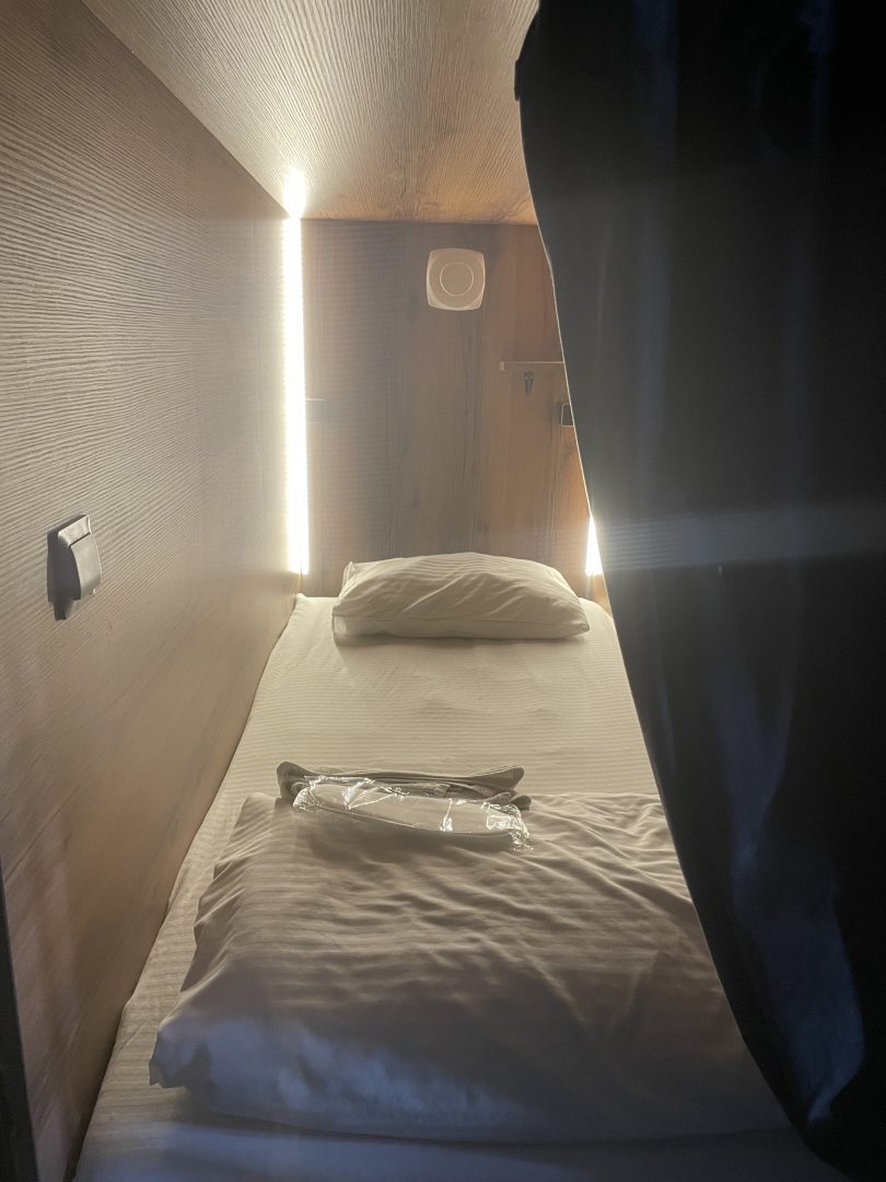 Останавливалась в хостеле на одну ночь, всё прошло комфортно и спокойно. Понравилось удобное расположение: легко добраться от метро и быстро дойти до основных городских локаций. Капсулы оказались гораздо просторнее, чем ожидала: удобный матрас, розетки под рукой, свет и вентиляция, можно спокойно отдохнуть и выспаться. В общих зонах поддерживают чистоту, душевые и туалеты в нормальном состоянии, горячая вода без перебоев. На кухне есть всё необходимое, чтобы разогреть еду и попить чайкофе, атмосфера в целом дружелюбная. Персонал вежливый и отзывчивый, быстро подсказали по заселению и по городу, было приятно общаться. Цена за ночь вполне оправдана условиями и расположением, формат капсульного хостела удобно подходит для коротких поездок.