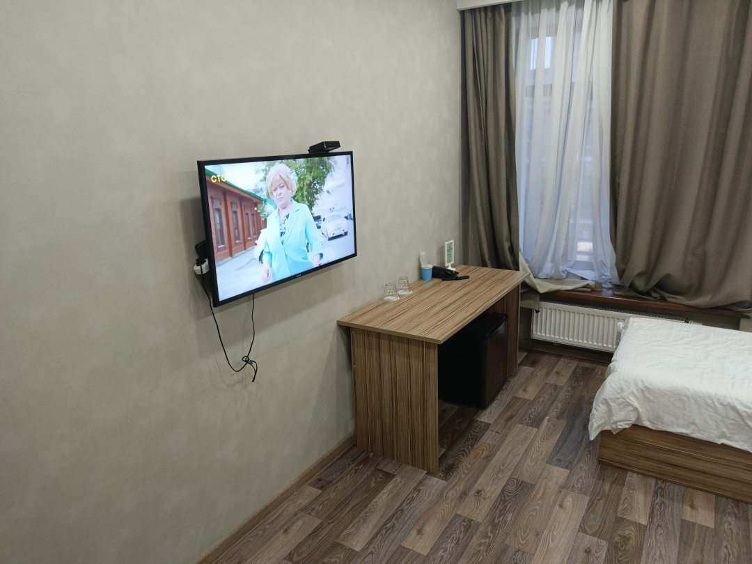 Из недостатков: горячая вода в кулере в коридоре, из посуды только два стаканчика. Вечерами не было горячей воды, днем теплая. Номер выходил окнами на улицу, при ветре с закрытыми окнами чувствовался сквозняк.