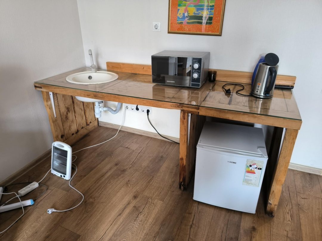 На кухне не хватало ложек, вилок. Видимо, жильцы расстащили по номерам. Нормальногокухонного ножа вообще не было, только столовые.