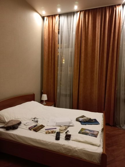 Кроме того, свет был только под потолком в виде круглых маленьких светящихся шариков, и на тумбочке у кровати стоял ночничок с коротким проводом. В номере есть письменный стол, но лампы на нем нет. Окно занавешено плотной шторой, она защищает от холода. Даже утром в комнате довольно темно. Но это не так важно, т.к. уже в 9 утра я уезжала в архив, где была до 17 час.